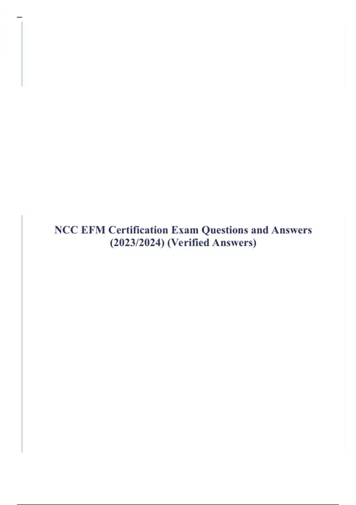 1 Exam (elaborations) NCC EFM Exam Breakdown & Study Guide 2023/2024 2 Exam (elaborations) NCC Electronic Fetal Monitoring Certification Exam Questions and Answers (2023/2024) (Verified Answers) 3 Exam (elaborations) NCC EFM practice Exam Questions and Answers (2023/2024) (Verified Answers) 4 Exam (elaborations) NCC EFM Certification Exam Questi