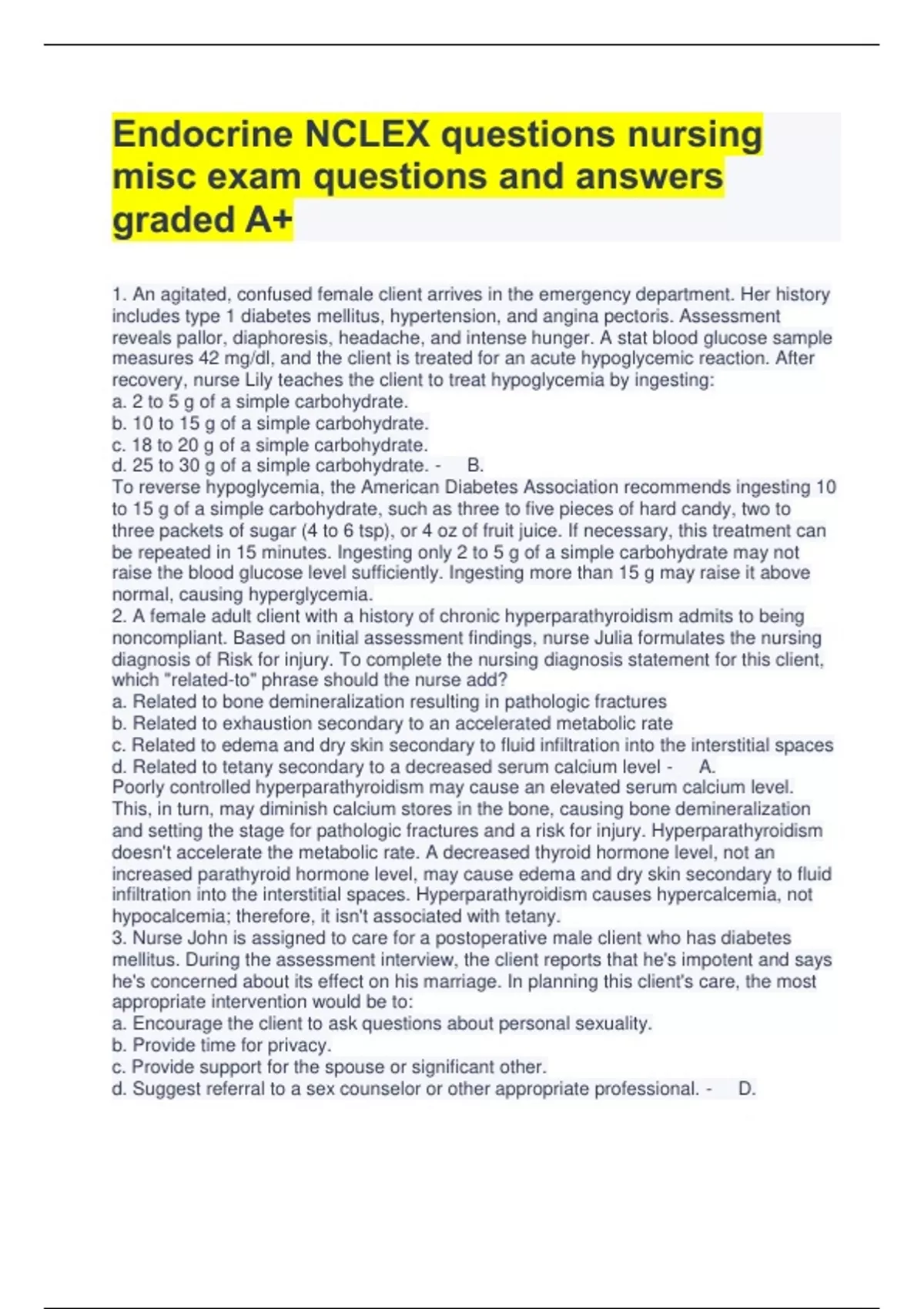 Summary NURSING : Endo Nclex Test Bank - Latest (2022) Complete solution, A+ Work. complete bundle 1 Exam (elaborations) Endocrine NCLEX questions nursing misc exam questions and answers graded A+ 2 Exam (elaborations) Endocrine NCLEX Questions and answers verified A+ material fall 2023 3 Exam (elaborations) Endocrine Nursing -- Practice Question