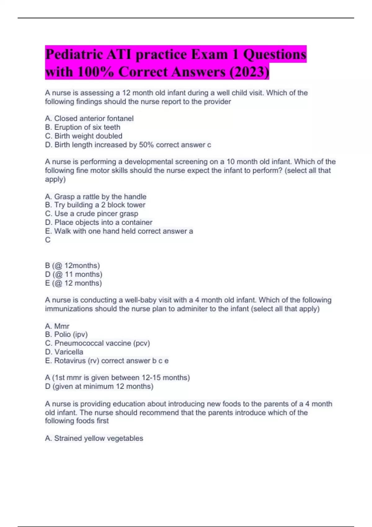 Pediatric ATI Exam Practice Questions with Complete Solutions (100% Correct) 2023 ATI Pediatrics Exam Questions with Complete Solutions Pediatric ATI Exam Questions with Complete Solutions (100% Correct Answers) Pediatric ATI Exam Questions with Complete Solutions (100% Correct Answers) Pediatrics ATI Exam Questions with 100% Correct Answers