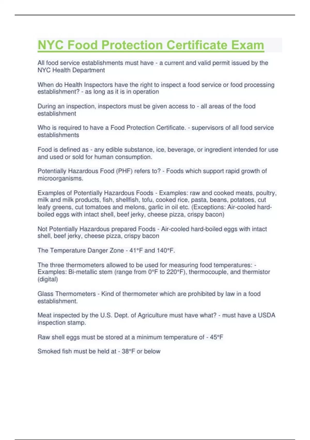 Exam questions related to safety and quality handling of food