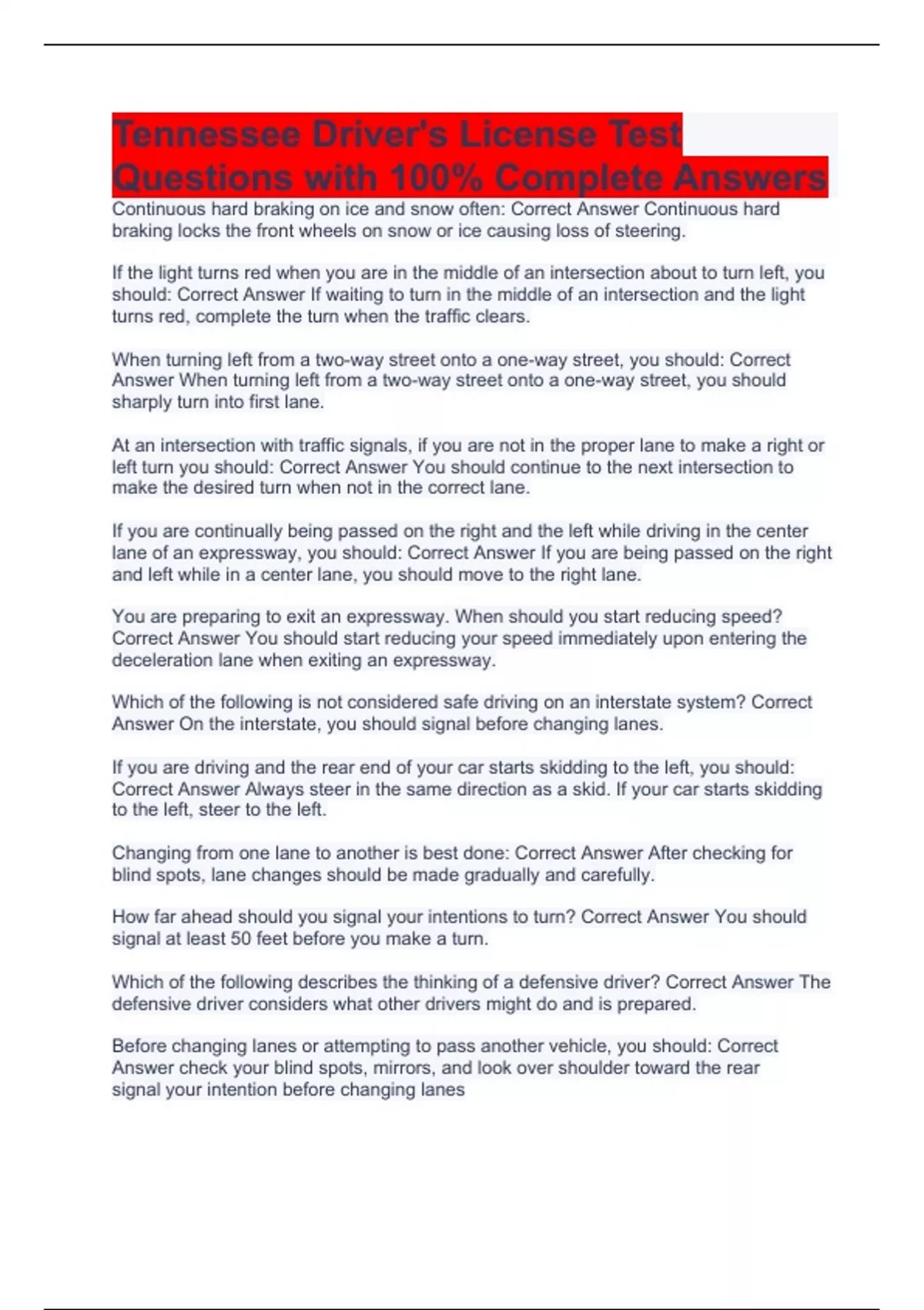 Tennessee Driver s License Test Questions with 100% Complete Answers