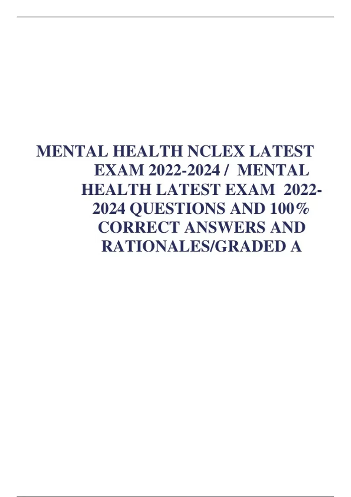 MENTAL HEALTH NCLEX LATEST EXAM / MENTAL HEALTH LATEST EXAM QUESTIONS AND 100% CORRECT ANSWERS AND RATIONALES/GRADED A