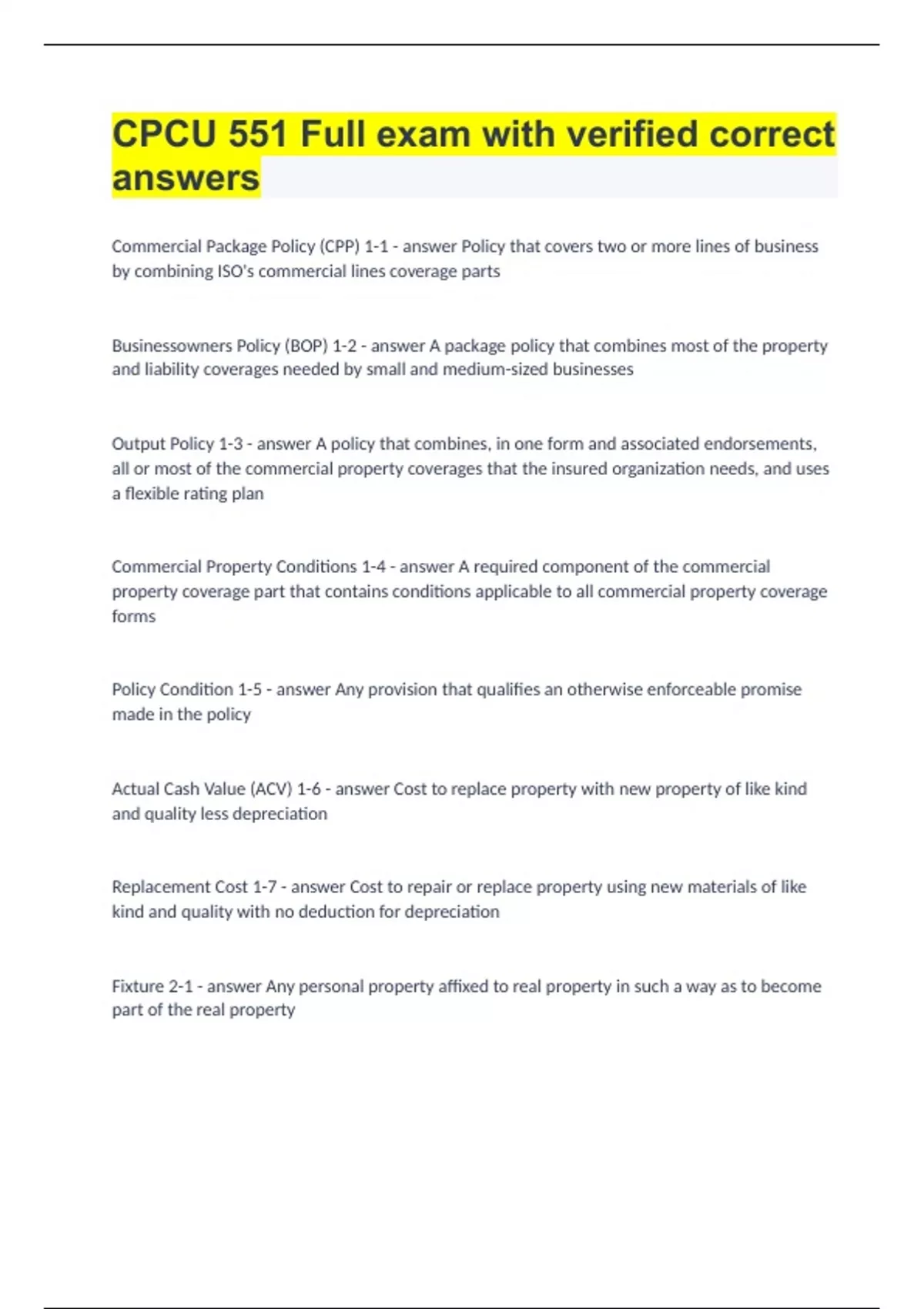 CPCU 551 Full exam with verified correct answers.