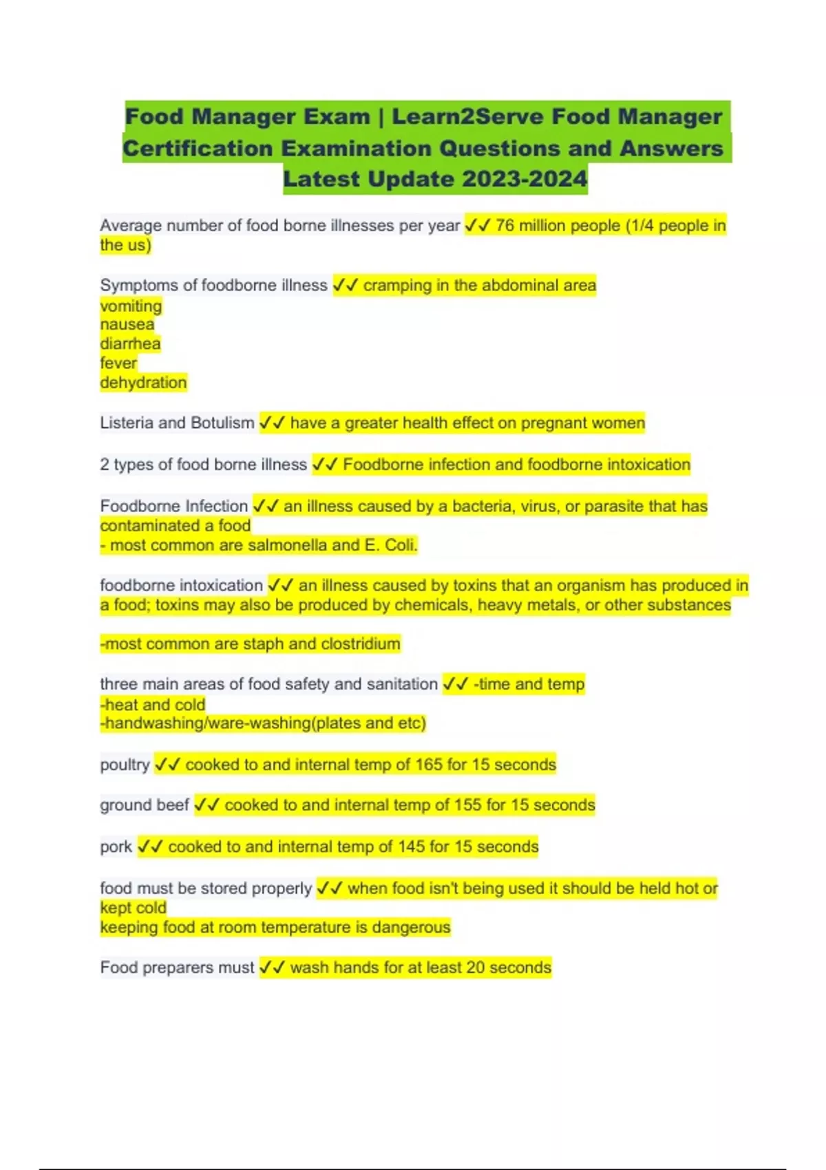 Food Manager Certification Exam Questions and Answers - Latest Updated | Food Manager Certification Exam Questions With Correct Answers | Food Manager Exam | Learn2Serve Food Manager Certification Exam AND Food Manager Exam Questions and Answers | Latest Update | 100% Verified
