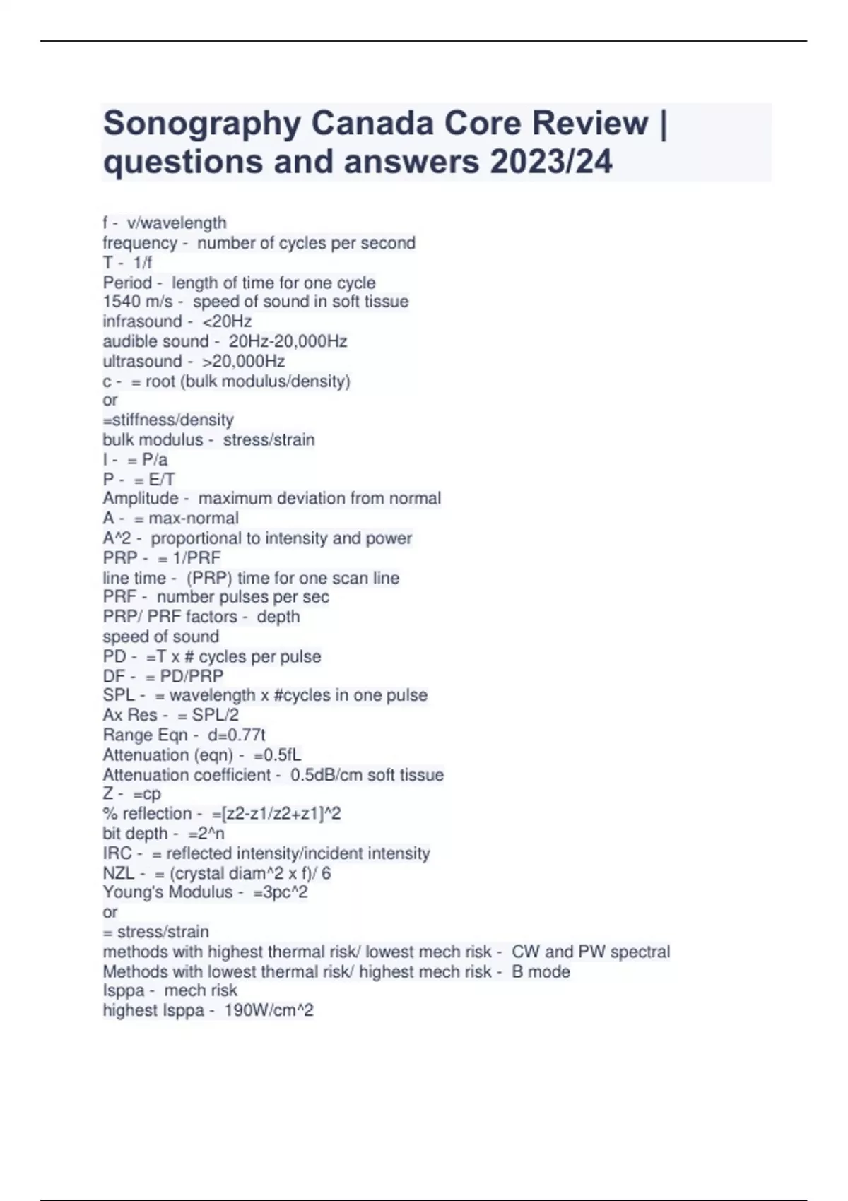 Exam (elaborations) Sonography Canada CORE (Physics) | 2023/24 questions and answersSonography Practice Core 2023/24,SONOGRAPHY CANADA PHYSICS CORE 2023/24 WITH COMPLETE SOLUTION,Core Sonography Canada Exam | 106 questions and answers latest 2023/24,Sonography Canada Core Review | questions and answers 2023/24 ,