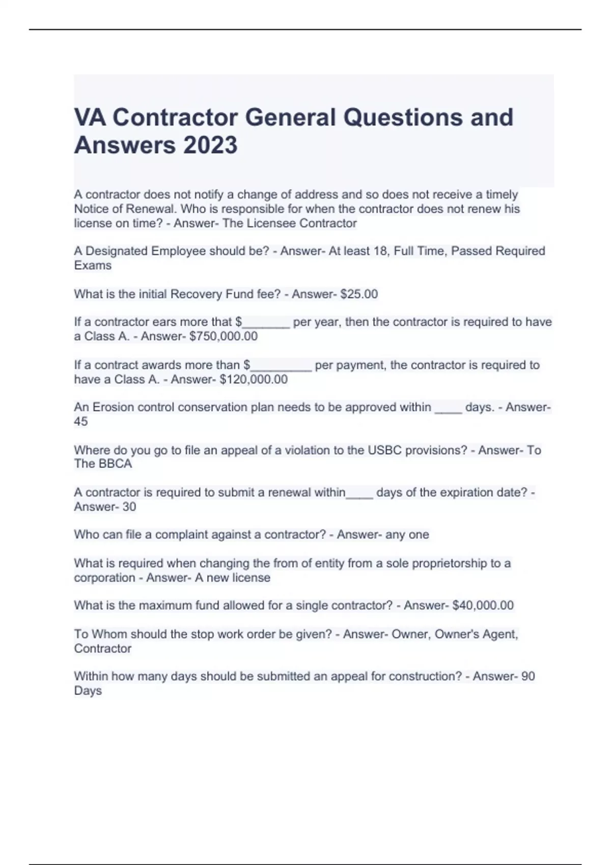 VA Contractor General Questions and Answers 2023 VA Contractors: VA Advanced (Class A) Exam Questions and Answers VA Contractors: Virginia (Class A or B) Exam Questions and Answers VA Contractors: General (Class A or B) Exam Questions and Answers Naslca Virginia Exam Practice Questions and Answers NASCLA Contractors Guide Virginia, 8th Ed Chapter