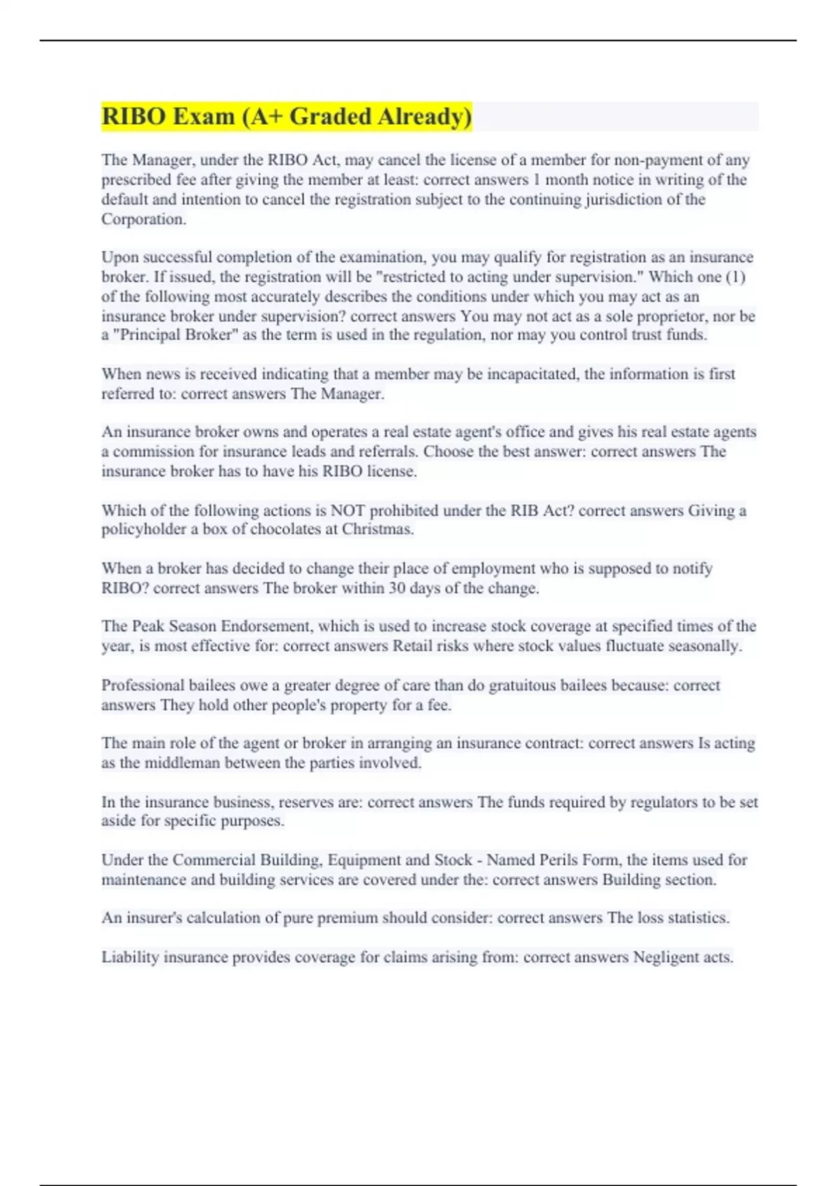 RIBO Exam (A+ Graded Already) RIBO regulations (with Complete Solutions) RIBO (A+ Guaranteed) RIBO Exam One (100% Errorless Answers) RIBO Definitions (All Accurate 100%) RIBO TEST #3 HOME INSURANCE (A+ GUARANTEED) RIBO auto (All Solved) RIBO – Habitational (100% Correct)