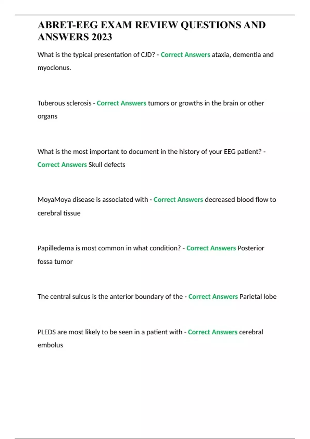 ABRET-EEG EXAM REVIEW QUESTIONS AND ANSWERS 2023 2 Exam (elaborations) ABRET EEG TEST QUESTIONS WITH VERIFIED ANSWERS 2023 3 Exam (elaborations) ABRET EXAM REVIW QUESTIONS WITH CORRECT ANSWERS RATED A 4 SUMMARY ABRET Normal Variants, Normal/Abnormal Adult EEG EXAM 2023 5 SUMMARY ABRET Practice Exam Part 1 questions and answers 6 SUMMARY ABRET