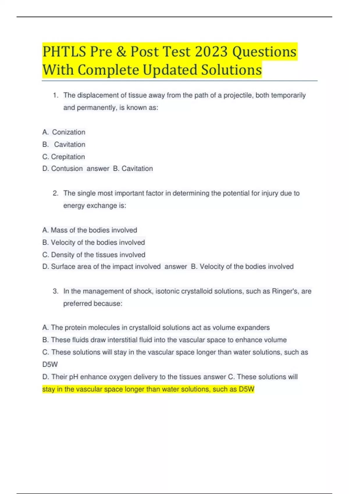 Prehospital Trauma Life Support (PHTLS) Review Test Questions 2023 With Complete Updated Solutions