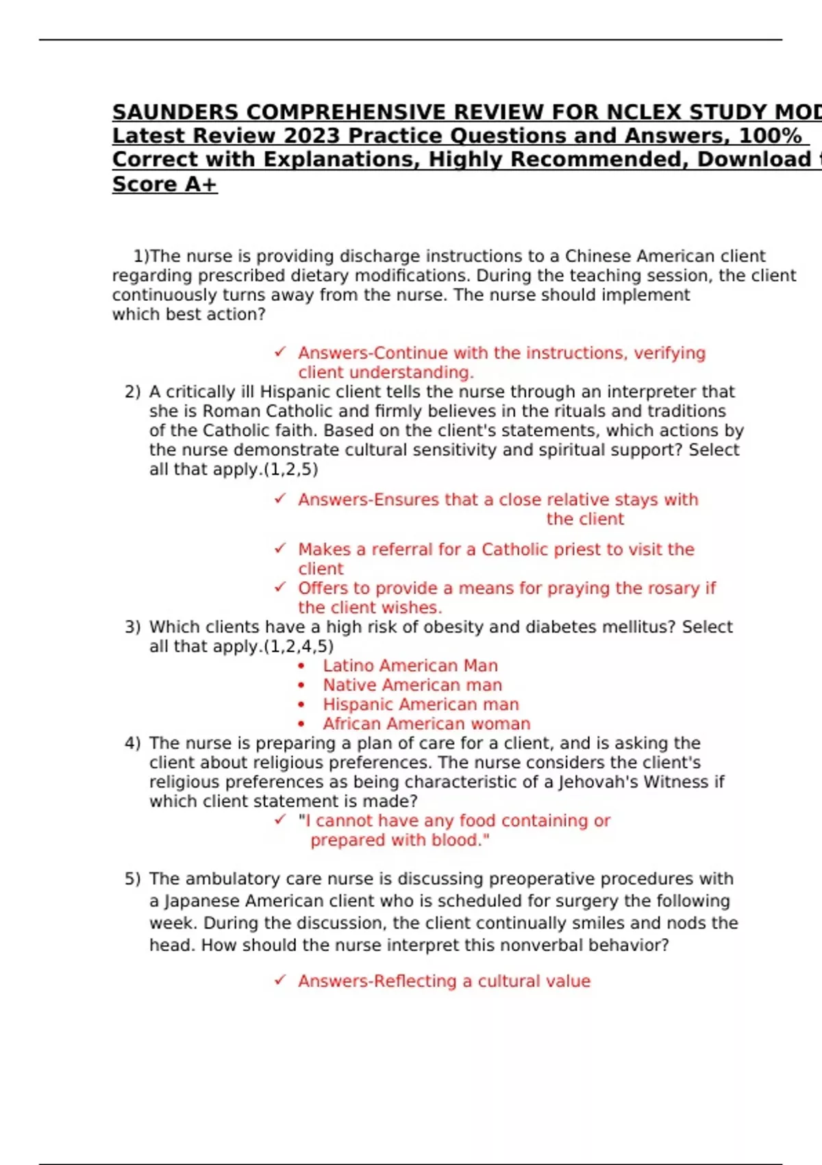SAUNDERS COMPREHENSIVE REVIEW FOR NCLEX FIVE STUDY MODE Latest Review 2023 Practice Questions and Answers, 100% Correct with Explanations, Highly Recommended, Download to Score A+