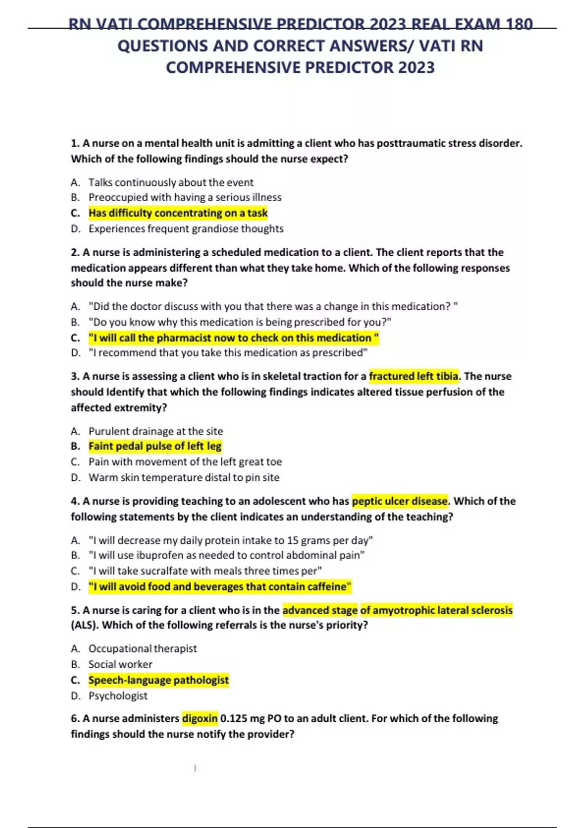 RN VATI COMPREHENSIVE PREDICTOR 2023 REAL EXAM 180 QUESTIONS AND CORRECT ANSWERS/ VATI RN COMPREHENSIVE PREDICTOR 2023