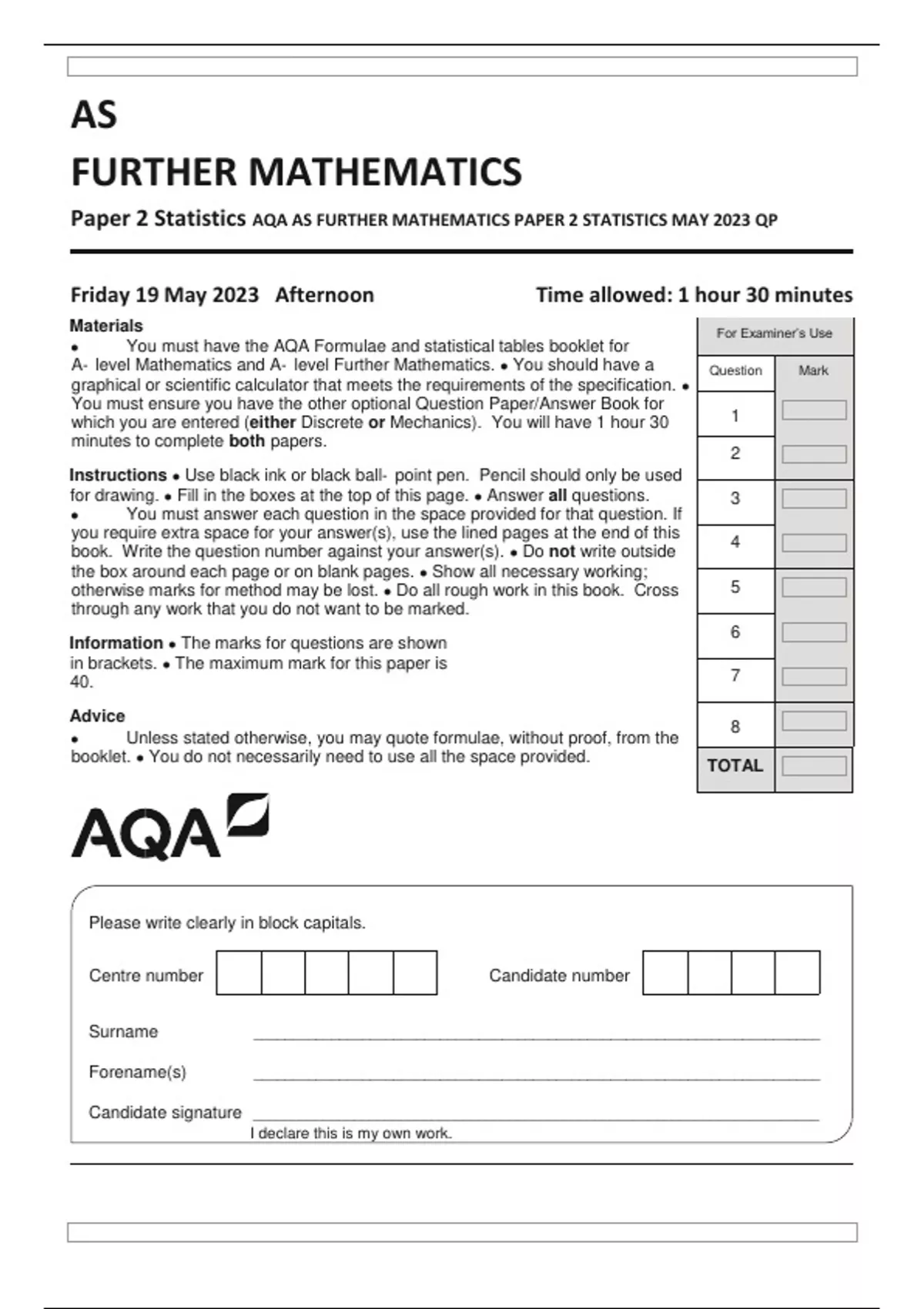 AQA AS FURTHER MATHEMATICS 7366/2S Paper 2 Statistics Question Paper and Mark scheme June 2023