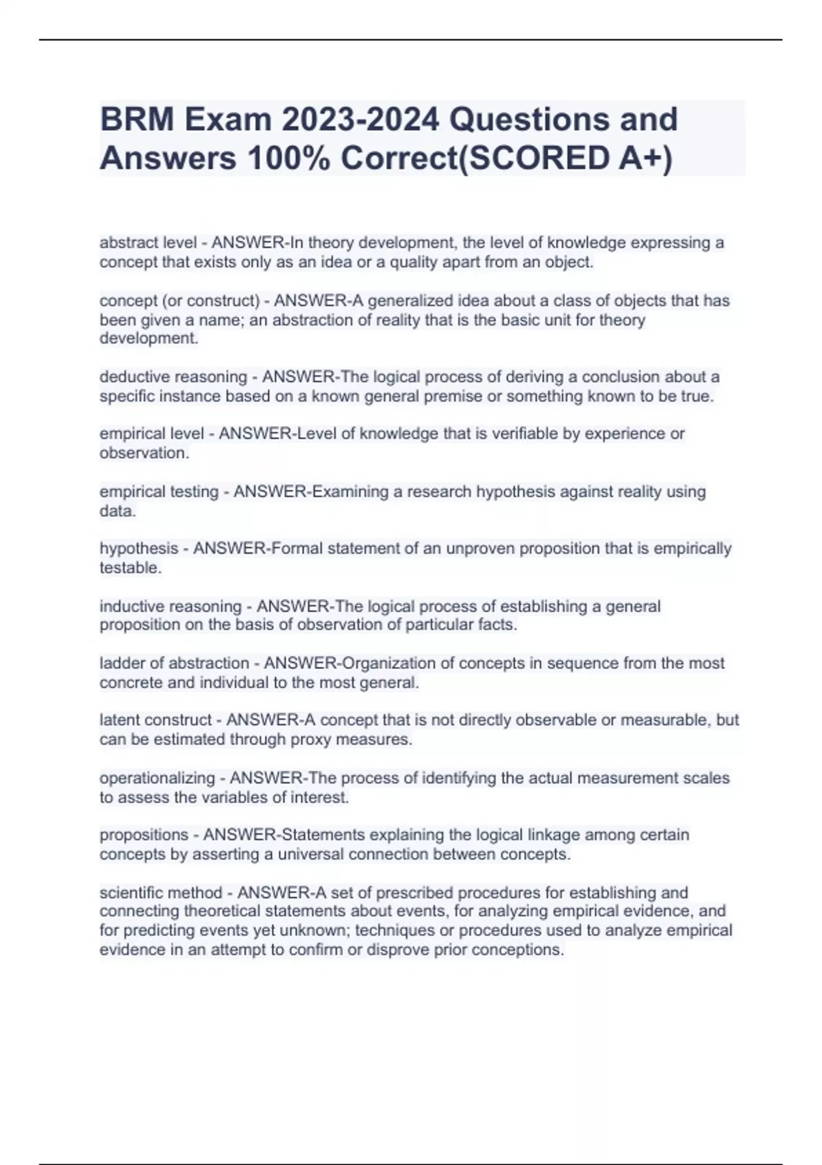 BRM Final Exam Study Guide with Complete Solutions 100% Verified!!