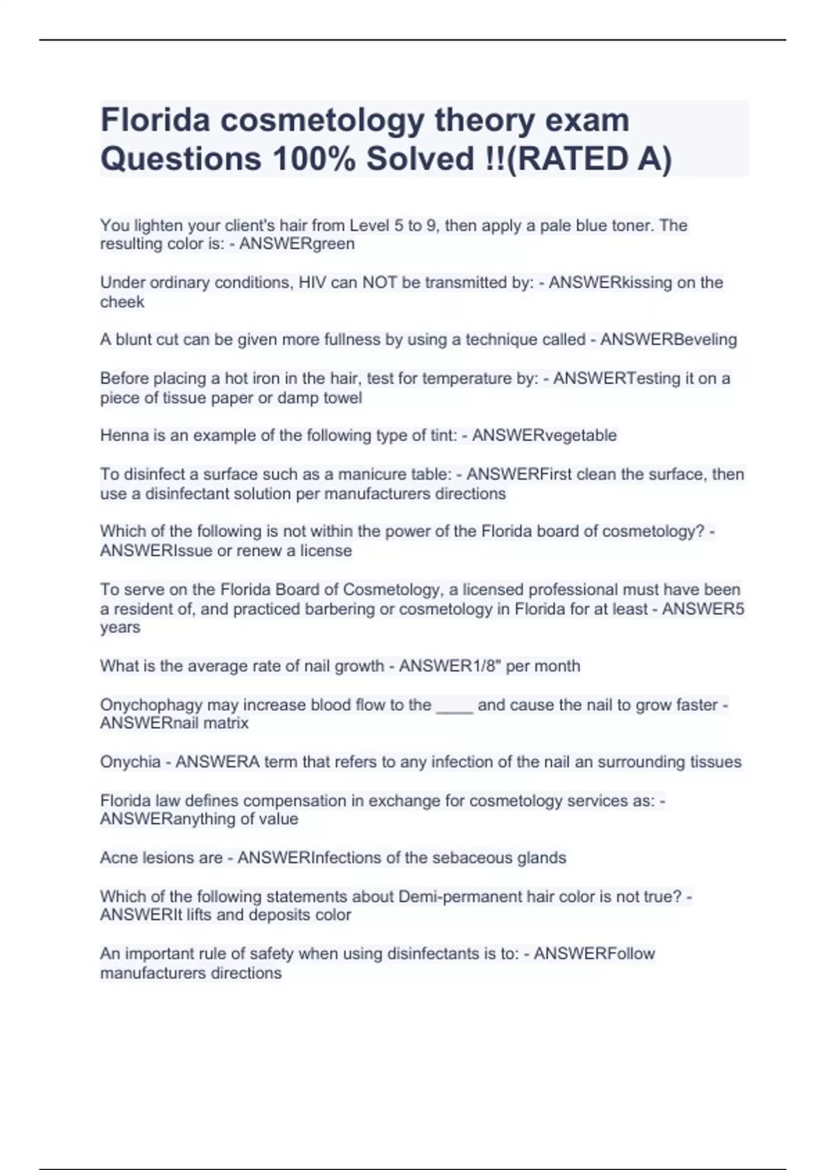FLORIDA STATE BOARD COSMETOLOGY EXAM BUNDLE QUESTIONS & ANSWERS(RATED A+)