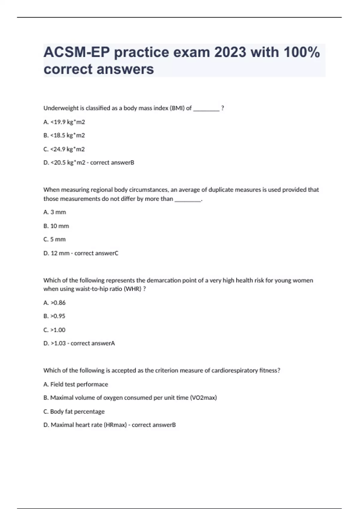 ACSM EP Exam 2023 with 100% correct answers ACSM Clinical Exercise Physiologist Exam 2023 with 100% correct answers