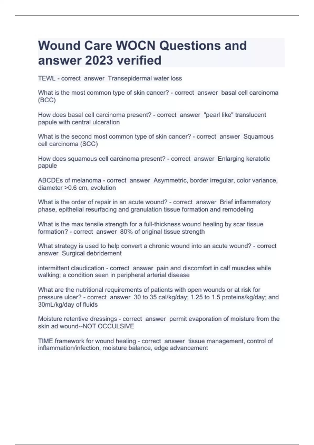 WOCN DIWAMOPI Questions with answer already solved 2023 Exam (elaborations) WOCN Wound Care RN Exam Prep Questions already sorted with A+ 2023 Exam (elaborations) WOCN Wound Exam Questions with complete solution 2023 Exam (elaborations) WOCN Wound Test 1 Questions and answer already passed 2023 Exam (elaborations) WOCN Question and answers