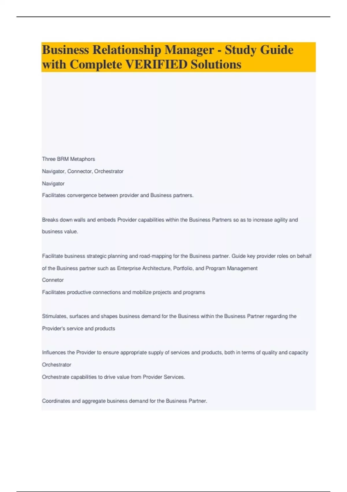 Business Relationship Manager - Study Guide with Complete VERIFIED Solutions
