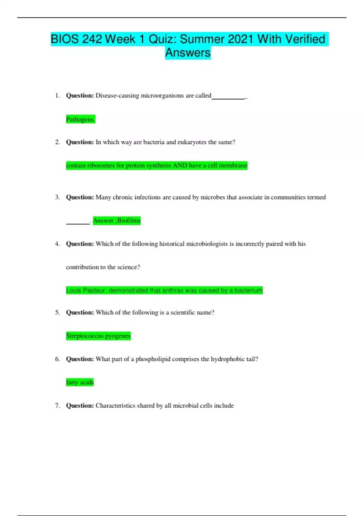 BIOS 242 WEEKLY CONCEPT REVIEWS, QUIZZES, MIDTERM EXAMS, AND FINAL EXAM FOR