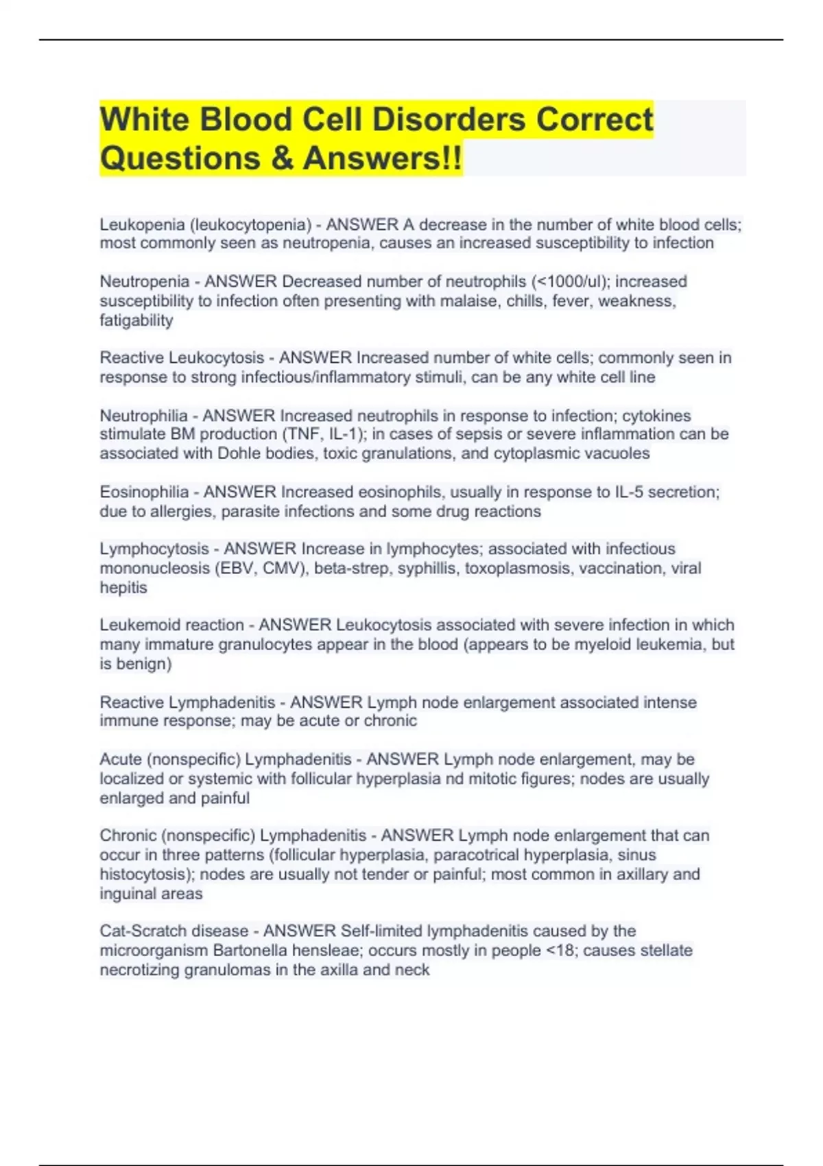 PACKAGE DEAL FOR White Blood Cell Disorder Complete Questions & Answers 100% Accurate (COMPLETE FULL SOLUTION PACK!!)