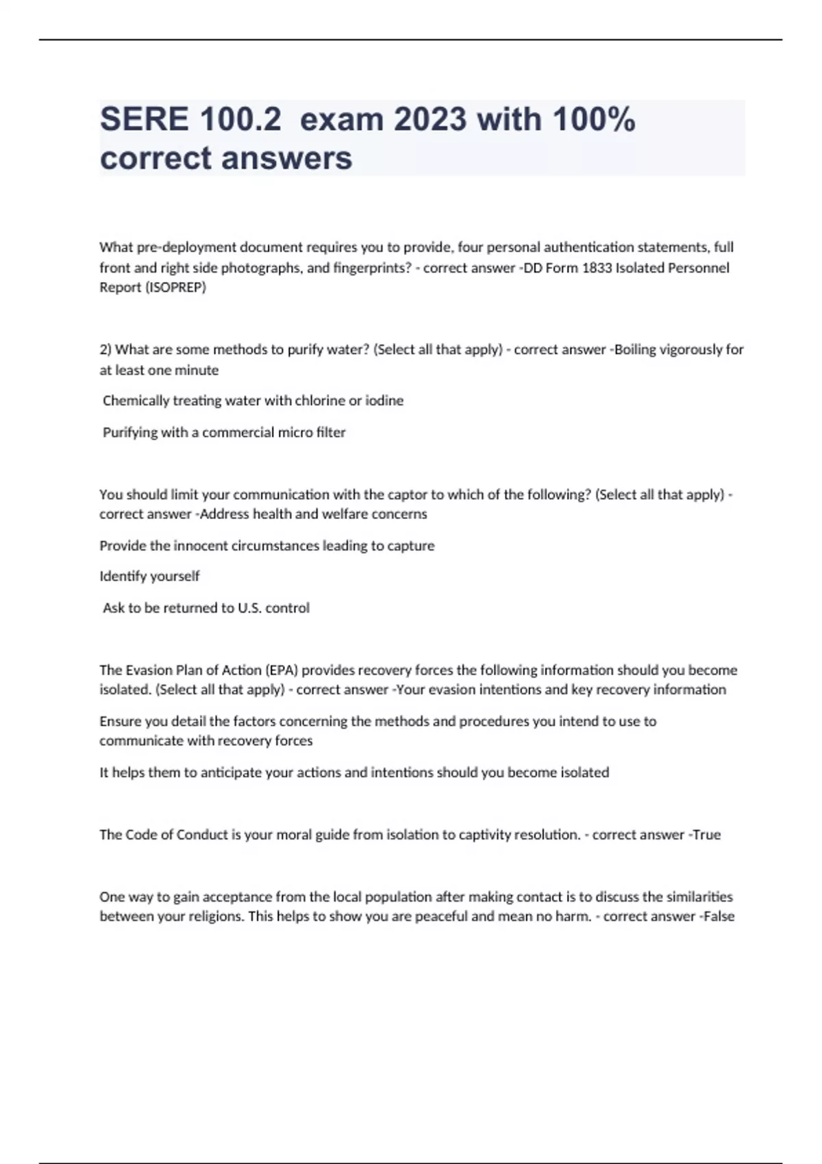 SERE 100.2 SERE 100.2 PRE TEST EXAM 2023 WITH 100% CORRECT ANSWERS
