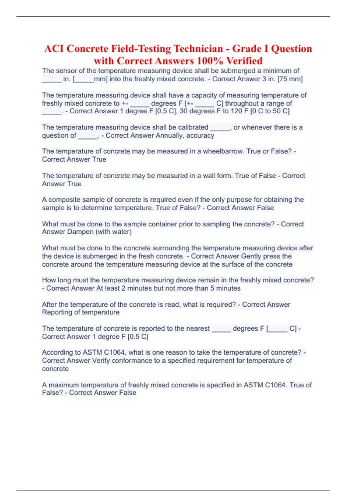 ACI Concrete Field-Testing Technician - Grade I Question with Correct Answers 100% Verified