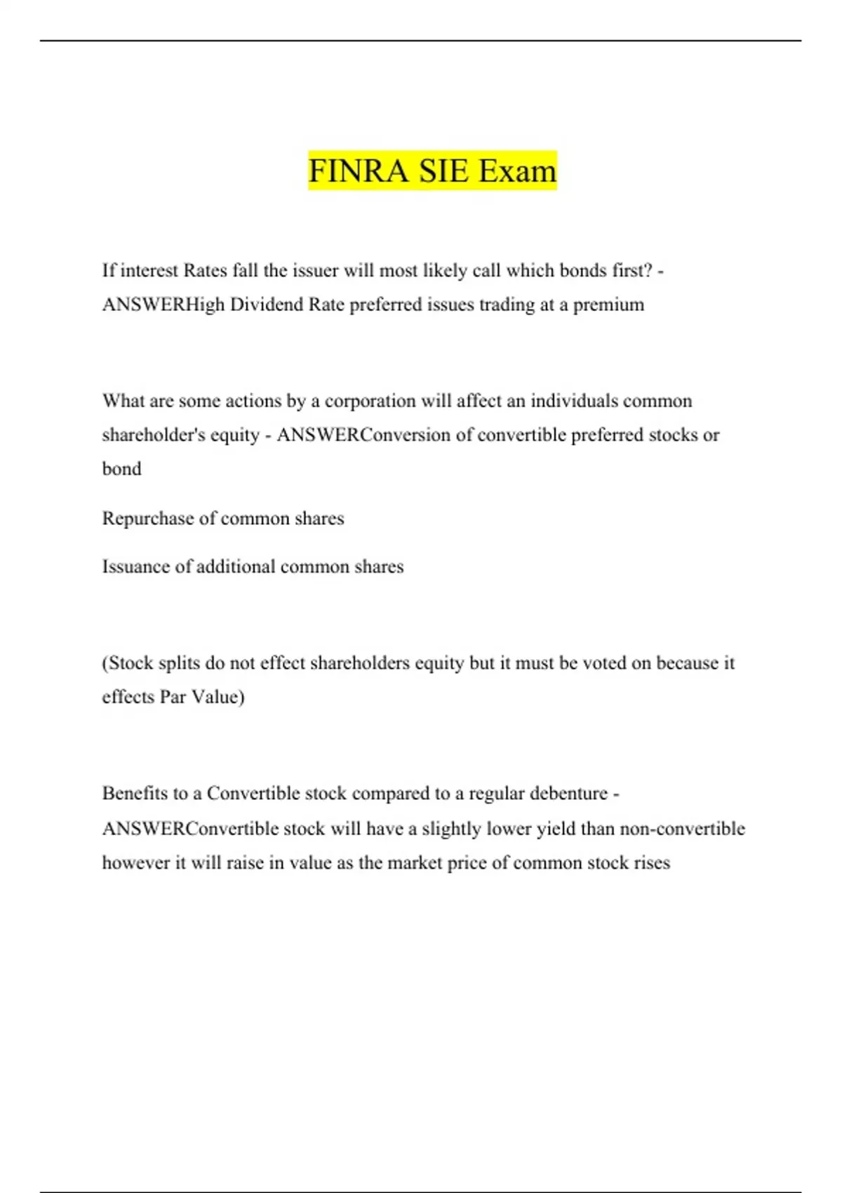 This Package has a lot of Finra SIE exams that has verified answers. I'M sure they will be of great assistance to you on your quest to success in your exams.