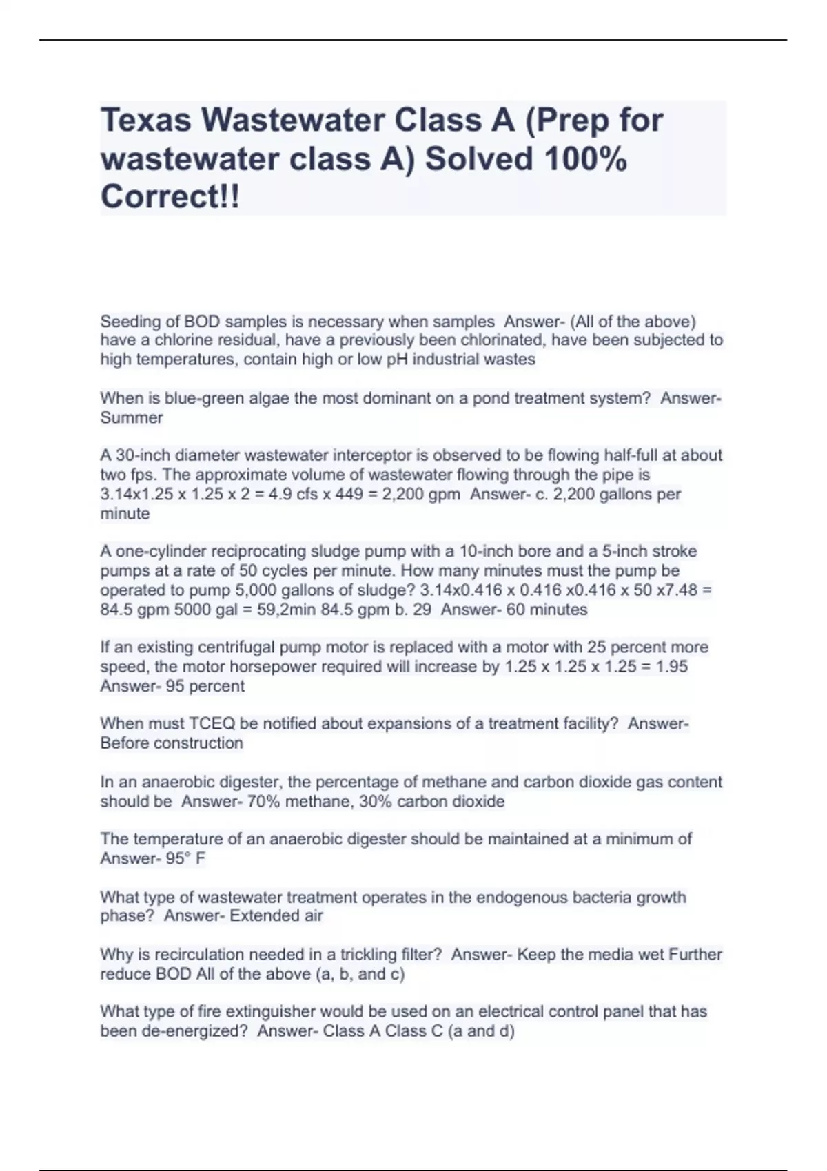 Texas Wastewater Class A (Prep for wastewater class A) Solved 100% Correct!!,Texas Wastewater A Exam Questions And Answers Already Passed!!,Wastewater Class B Texas Correctly Solved 100%,Texas Wastewater B exam,TX Class C Wastewater Treatment License Questions With Complete Solutions.,Basic Wastewater D Questions With Complete Solutions.,Waste Wate