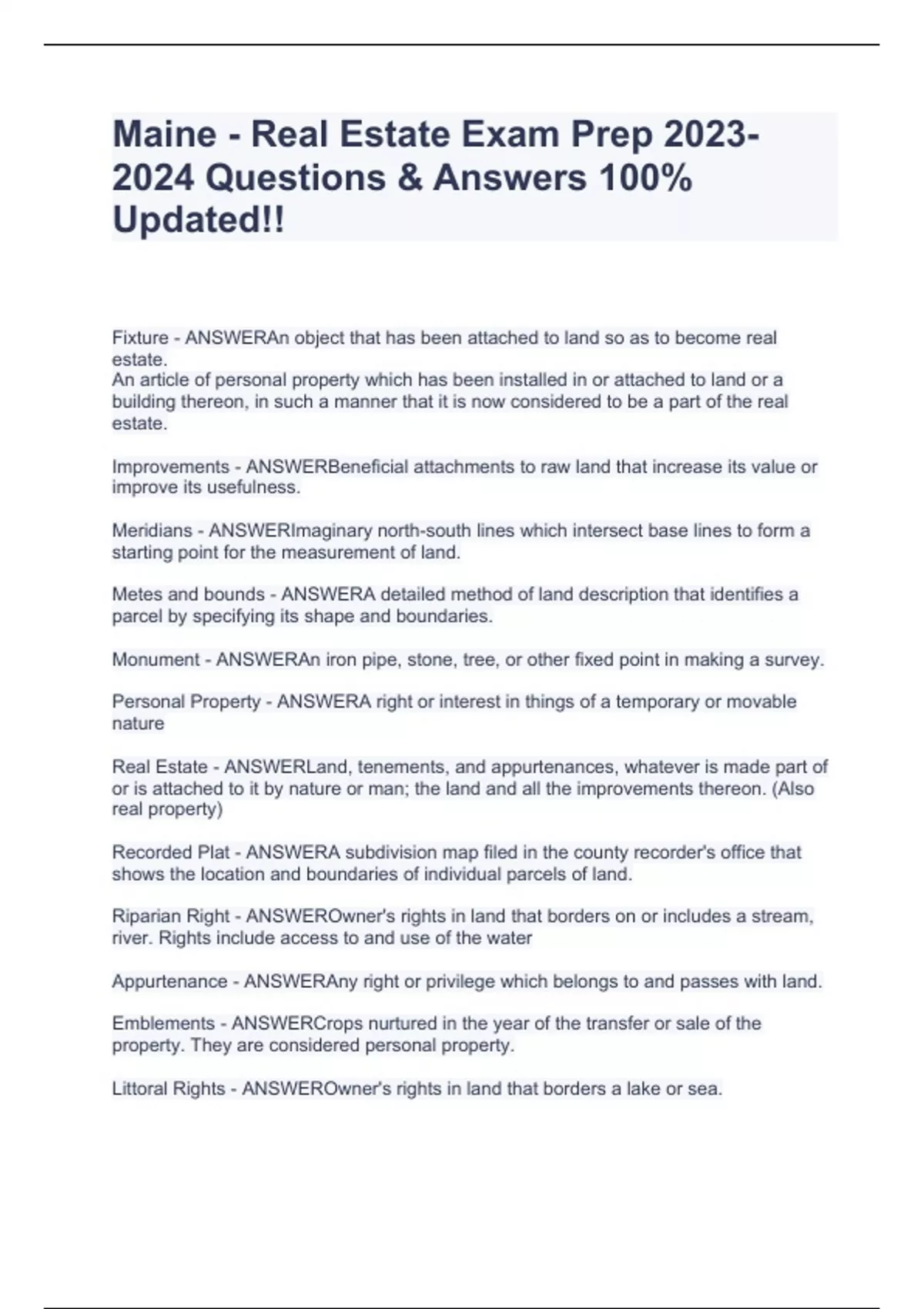 Maine Real Estate License Practice Exam PART 1 Questions & Answers 100% Verified!!Maine Real Estate License Practice Exam PART 1 Questions & Answers 100% Verified!!Maine Real Estate License Practice Exam PART 1 Questions & Answers 100% Verified!!Maine Real Estate License Practice Exam PART 1 Questions & Answers 100% Verified!!