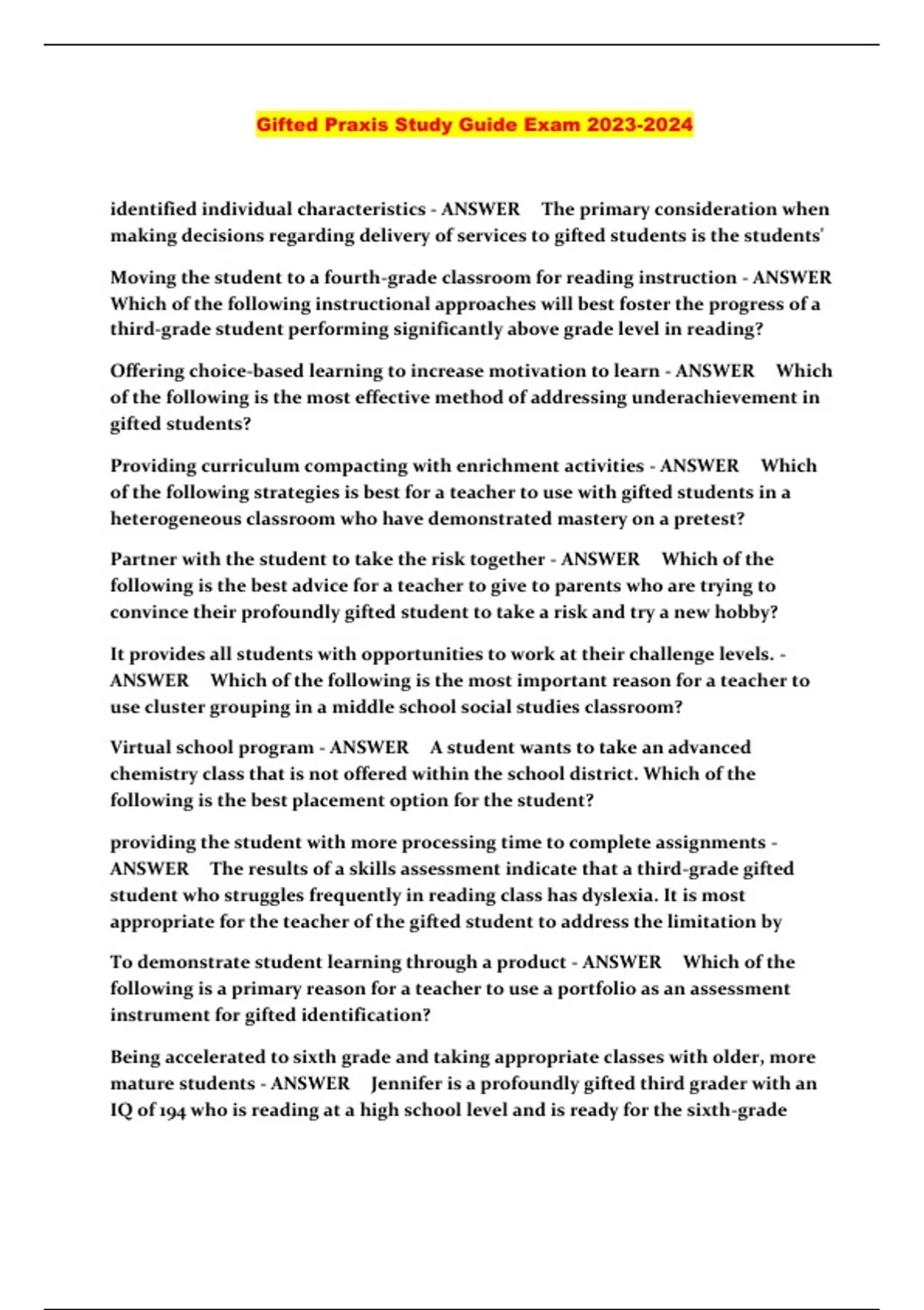 Gifted Praxis Exam With Questions and Answers