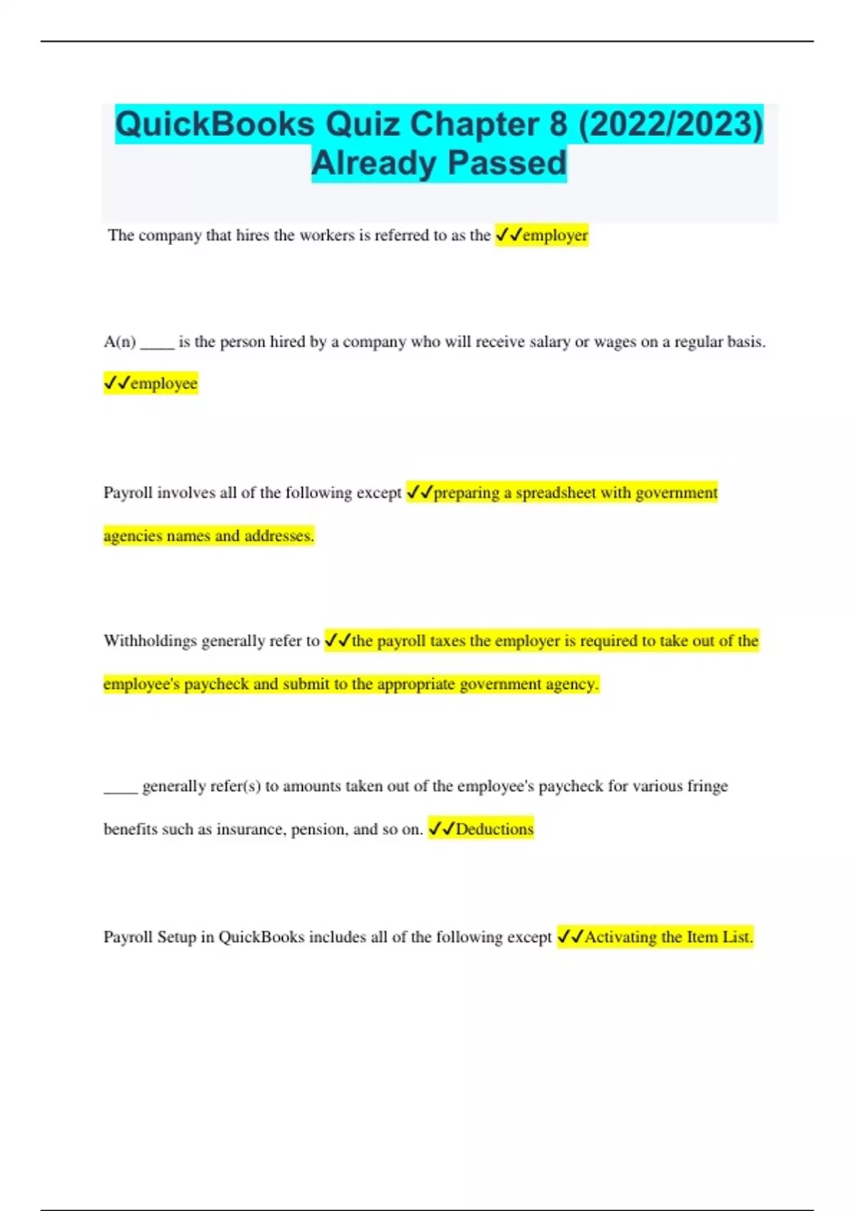 Explore variety of top rated documents, including; QuickBooks test questions and answers, QuickBooks exam questions and answers, QuickBooks practice exams, QuickBooks quizzes, QuickBooks practice questions and answers. All documents are graded A .