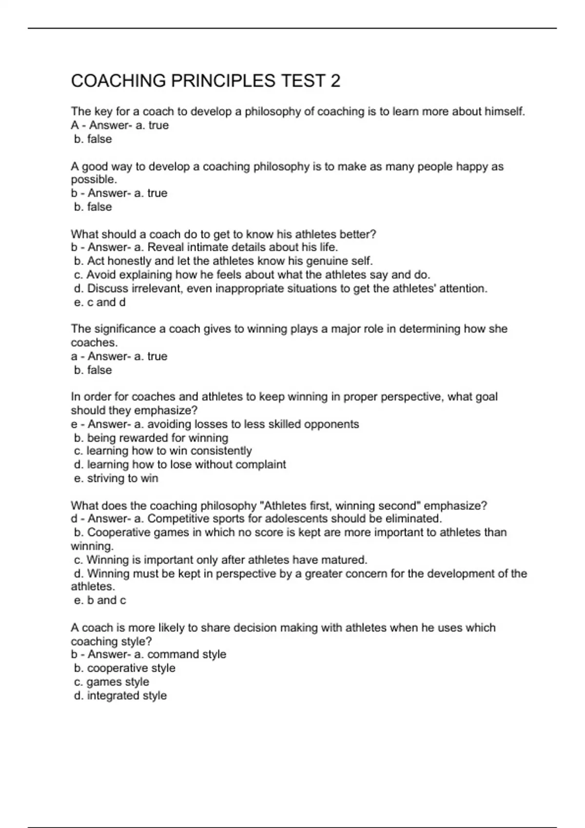 Exam (elaborations) COACHING PRINCIPLES TEST 2 2 Exam (elaborations) Coaching Principles Test, Coaching Principles Test 2 3 Exam (elaborations) COACHING PRINCIPLES QUESTIONS AND ANSWERS 4 Exam (elaborations) Coaching Principles Q&A