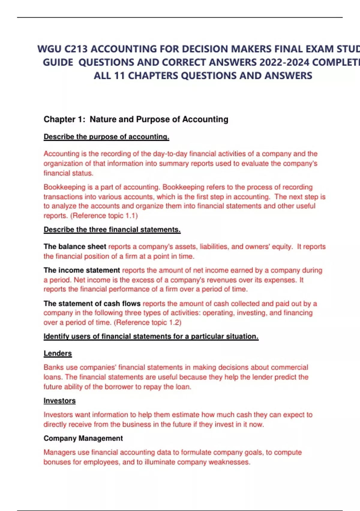WGU C213/WGU C213 ACCOUNTING FOR DECISION MAKERS FINAL EXAM STUDY GUIDE QUESTIONS AND CORRECT ANSWERS ALL 11 CHAPTERS QUESTIONS AND ANSWERS