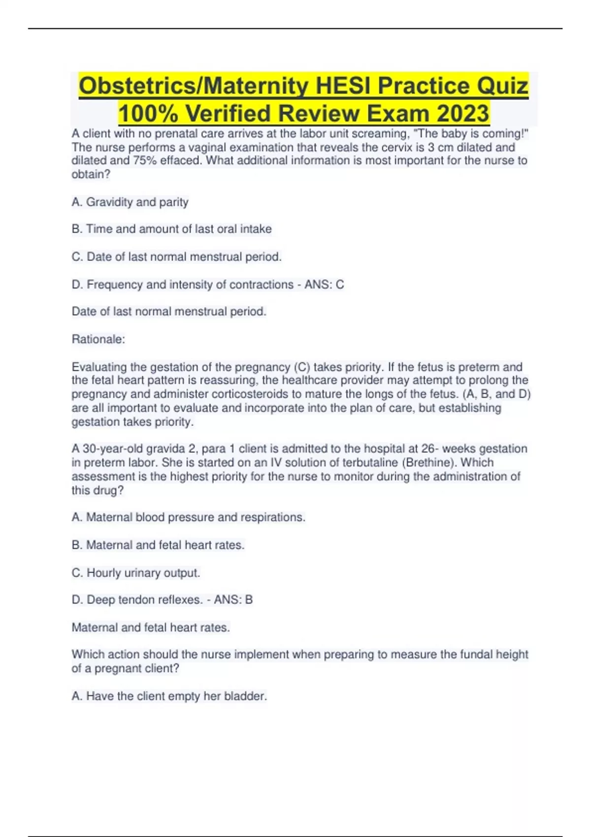 HESI OB/MATERNITY Practice Quiz Advanced Review Exam, HESI Obstetrics/Maternity Practice Exam Review , OB/Maternity HESI Assignment exam Verified Exam Review , OB/Maternity HESI Assignment exam Verified Exam Review , M