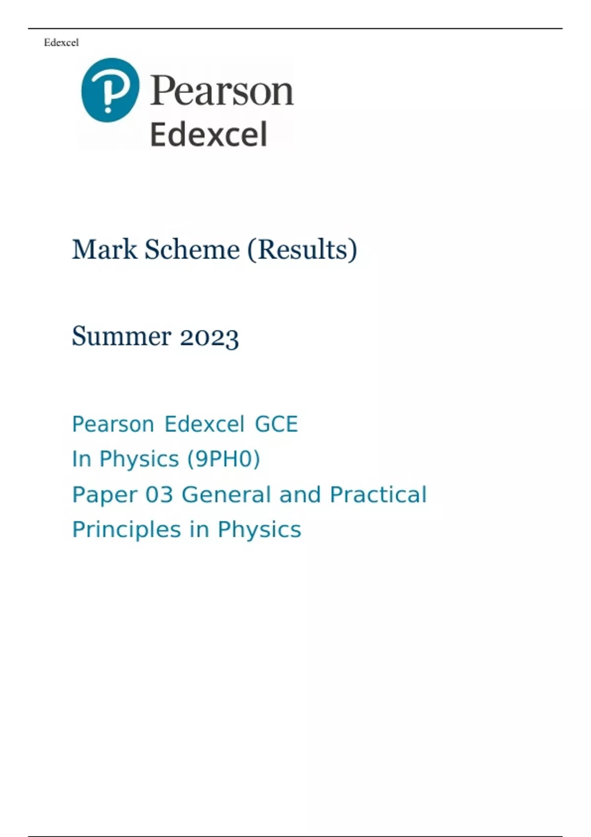 Pearson Edexcel GCE In Physics (9PH0) Paper 03 MARK SCHEME (Results) Summer 2023: General and Practical Principles in Physics