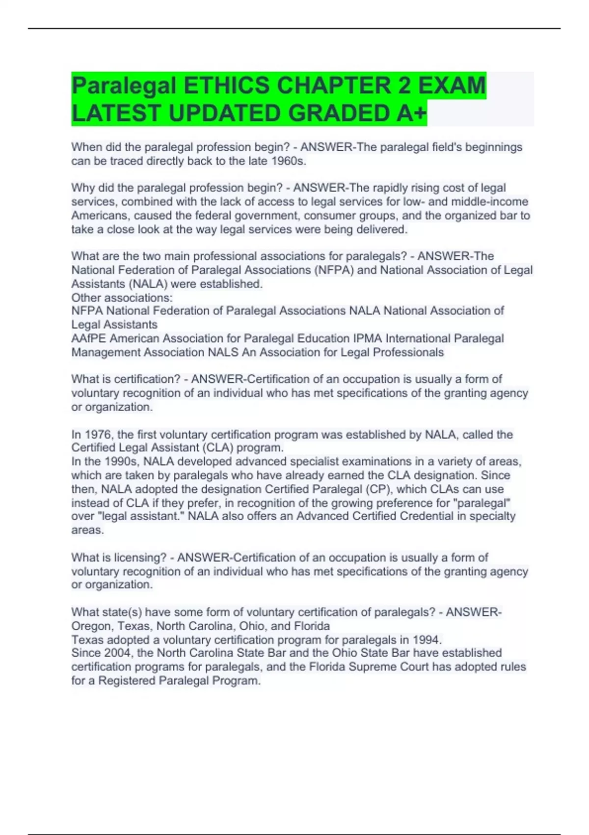 Paralegal ETHICS CHAPTER 2 EXAM LATEST UPDATED GRADED A+ 2 Exam (elaborations) Paralegal Exam Graded A+ 3 Exam (elaborations) Paralegal Core Competency Exam Solved 100% Correct 4 Exam (elaborations) Paralegal Exam #1 with Complete Solutions 5 Exam (elaborations) Paralegal Certification Exam Review 6 Exam (elaborations) Contract Law for Paraleg