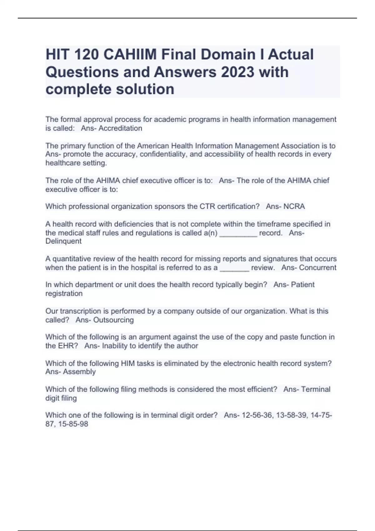 HIT 120 CAHIIM Final Domain I Actual Questions and Answers 2023 with complete solution HIT 120 CAHIIM DOMAIN V FINAL Exam 2023 Questions and Answers Complete HIT 120 CAHIIM DOMAIN III FINAL Exam 2023 Questions and Answers 100% Correct HIT 120 CAHIIM DOMAIN II Exam 2023 Actual Questions and Answers Complete