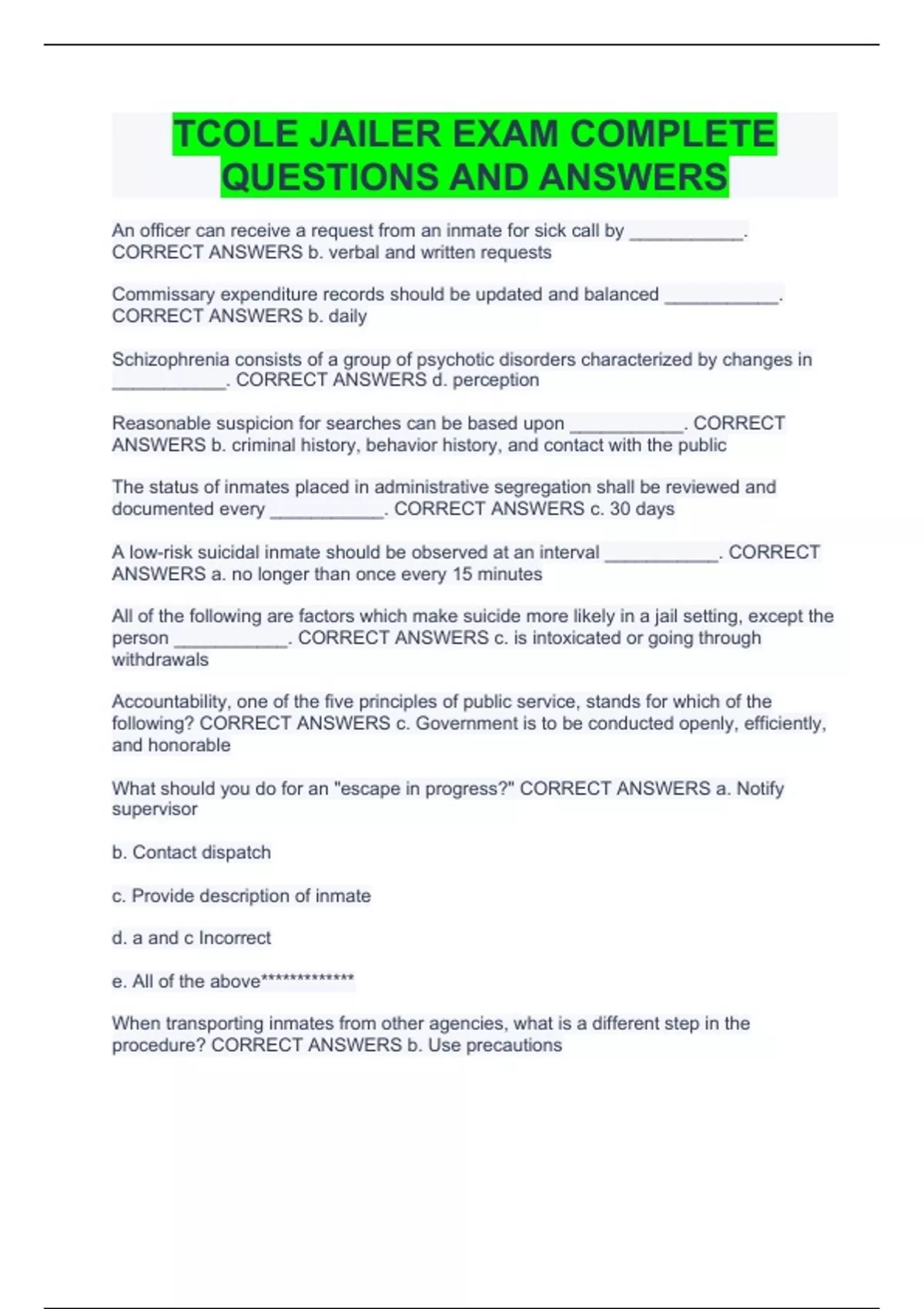 TCOLE JAILER EXAM COMPLETE QUESTIONS AND ANSWERS TCOLE Practice Jailer exam with complete solutions/GUARANTEED SUCCESS TCOLE Admin Exam Rated 100% Correct (Verified Answers)
