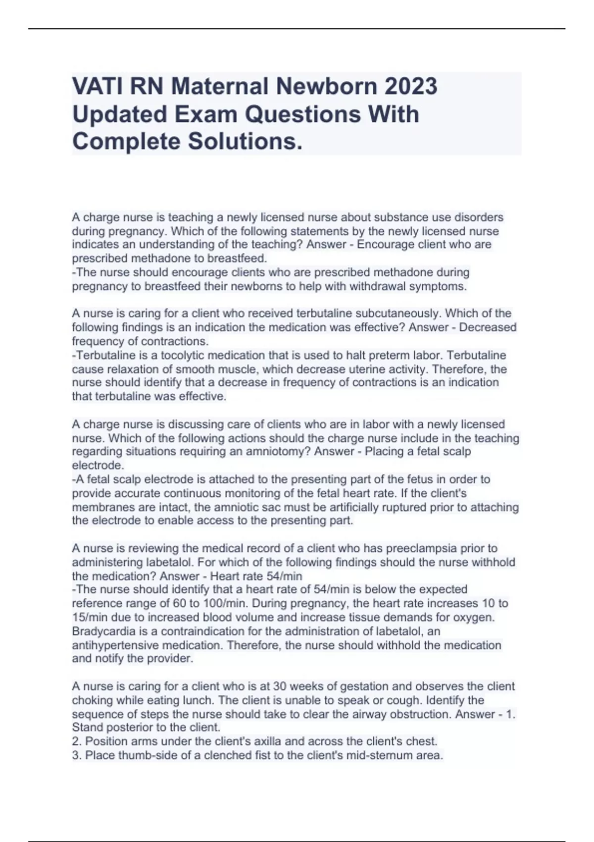VATI RN Maternal Newborn 2023 Updated Exam Questions With Complete Solutions.,VATI Maternal Newborn Exam Questions With 100% Solved Answers.,PN VATI Maternal Newborn Questions With Verified Solutions.,VATI Maternal Newborn Exam Quizzes With Correct Ans.,VATI Maternal Newborn Health Promotion and Maintenance Quizzes & Ans.,VATI Maternal newborn,VATI
