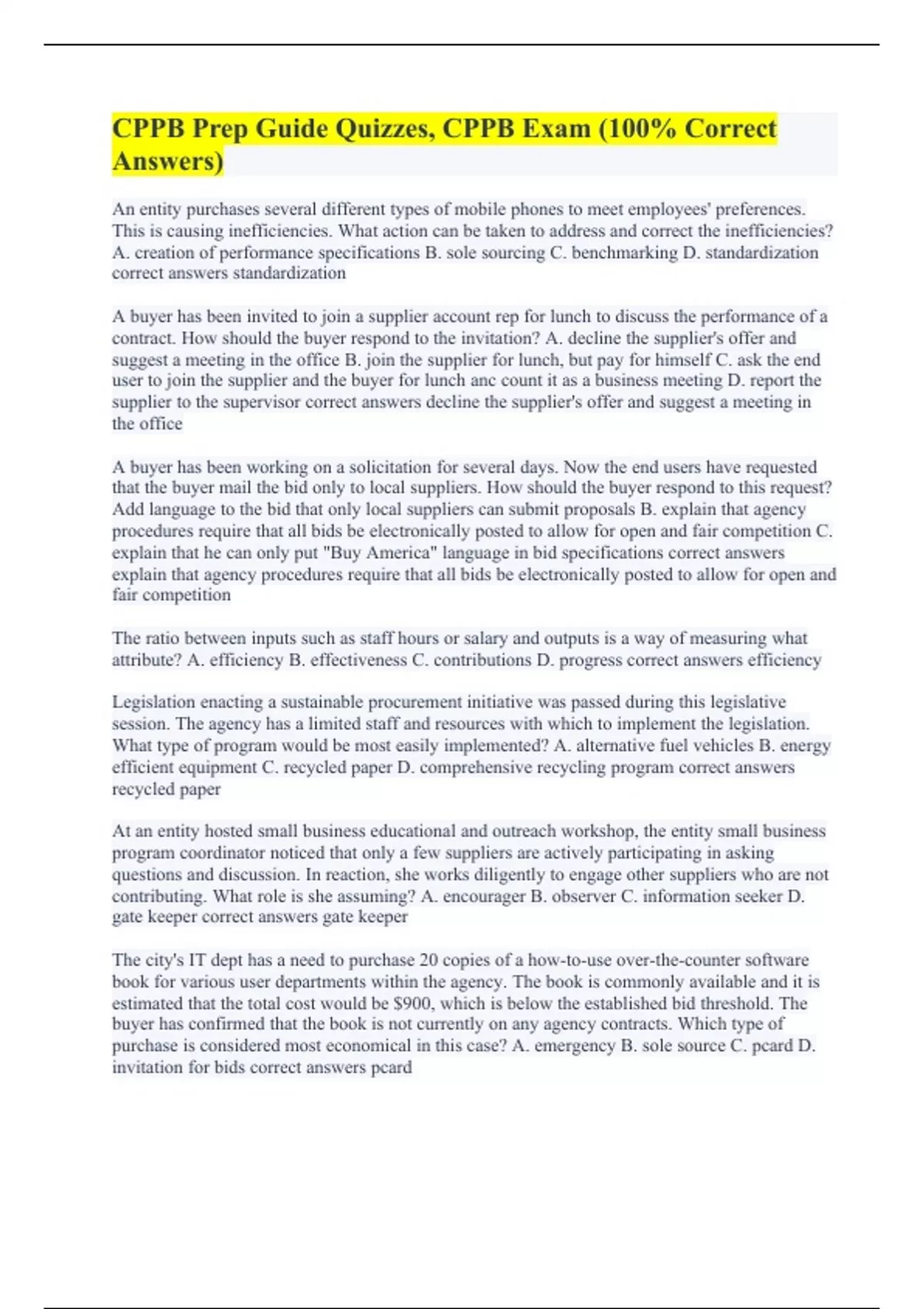 Misc. questions/terms to study for CPPB (with Complete Solutions) CPPB Prep Guide Quizzes, CPPB Exam (100% Correct Answers) CPPB (100% VERIFIED ANSWERS) CPPB Exam (100% Errorless Answers) CPPB Prep Course - Practice Test (100% Error-free Answers) CPPB exam prep (Already Graded A+) CPPB - Intro to Public Procurement (100% Accurate) CPPB Exam (All Ac