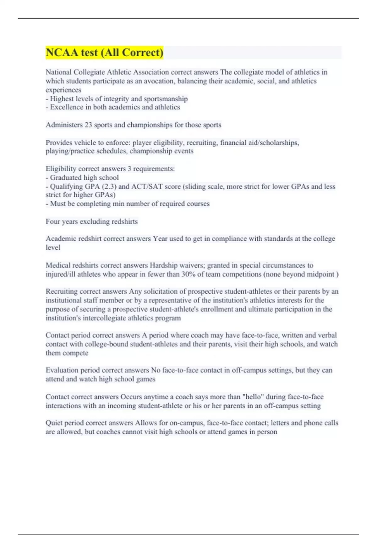 NCAA test (All Correct) NCAA Final (100% Correct) NCAA Test- ALL sports (A+ Graded Already) NCAA Recruiting Exam (with 100% Accurate Solutions) NCAA Compliance Midterm (100% Error-free Answers) NCAA Exam 1 (100% Errorless Answers) NCAA Exam 1 (with Complete Solutions) NCAA Coaches Exam (100% Verified Solutions) NCAA Compliance Exam (100% Accurate A