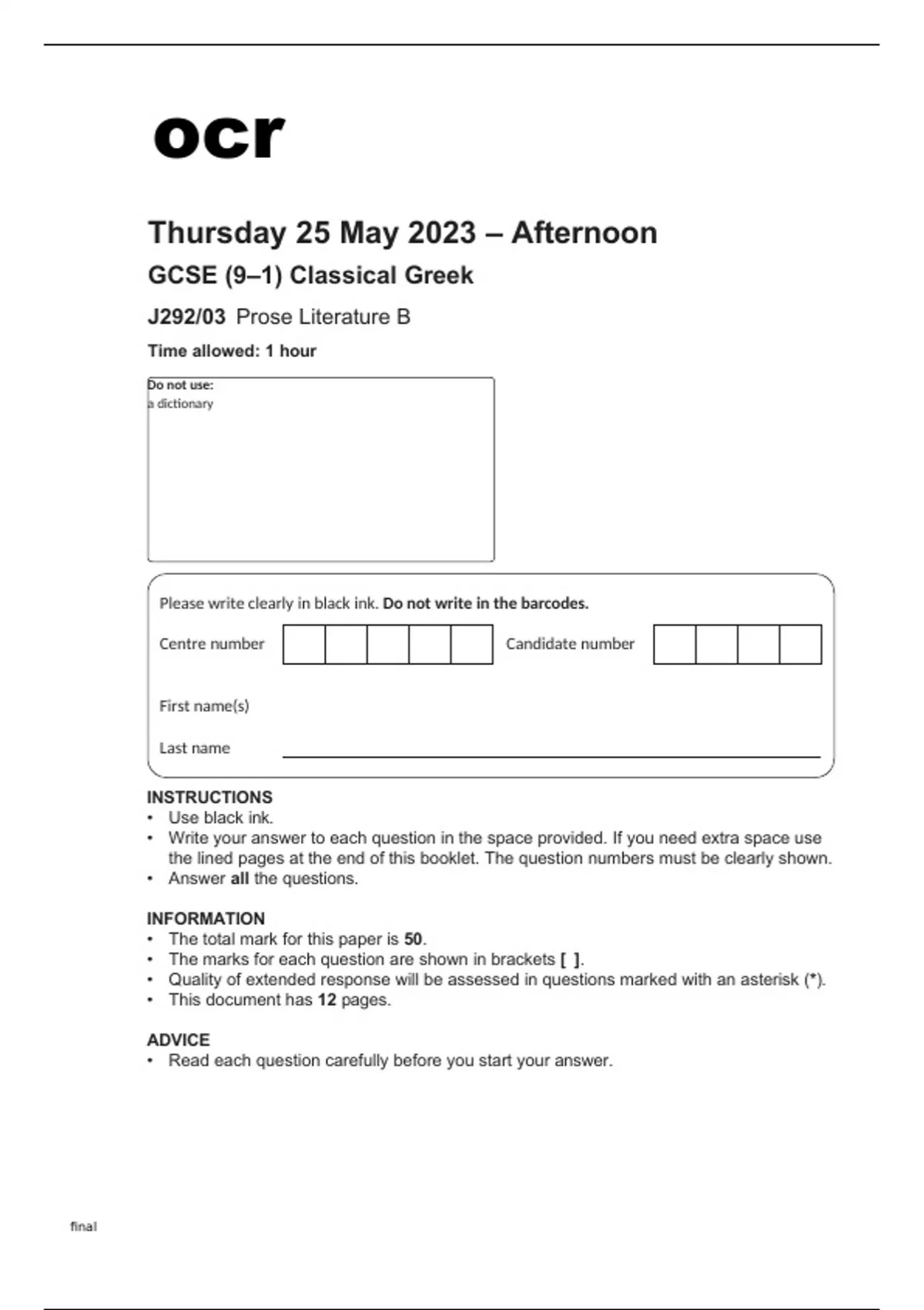 ocr GCSE Classical Greek J292/03 June2023 Question Paper and Mark Scheme. ocr GCSE Classical Greek J292-03 May2023 Question Paper. ocr GCSE Classical Greek J292-03 June2023 Mark Scheme. J292-03 QP and MS