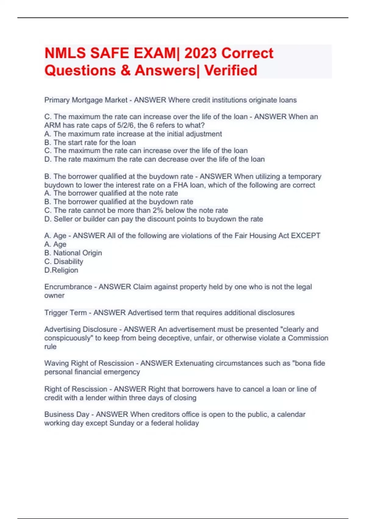PACKAGE DEAL FOR NMLS PRACTICE QUESTIONS & ANSWERS(RATED A+)(COMPLETE FULL SOLUTION PACK)