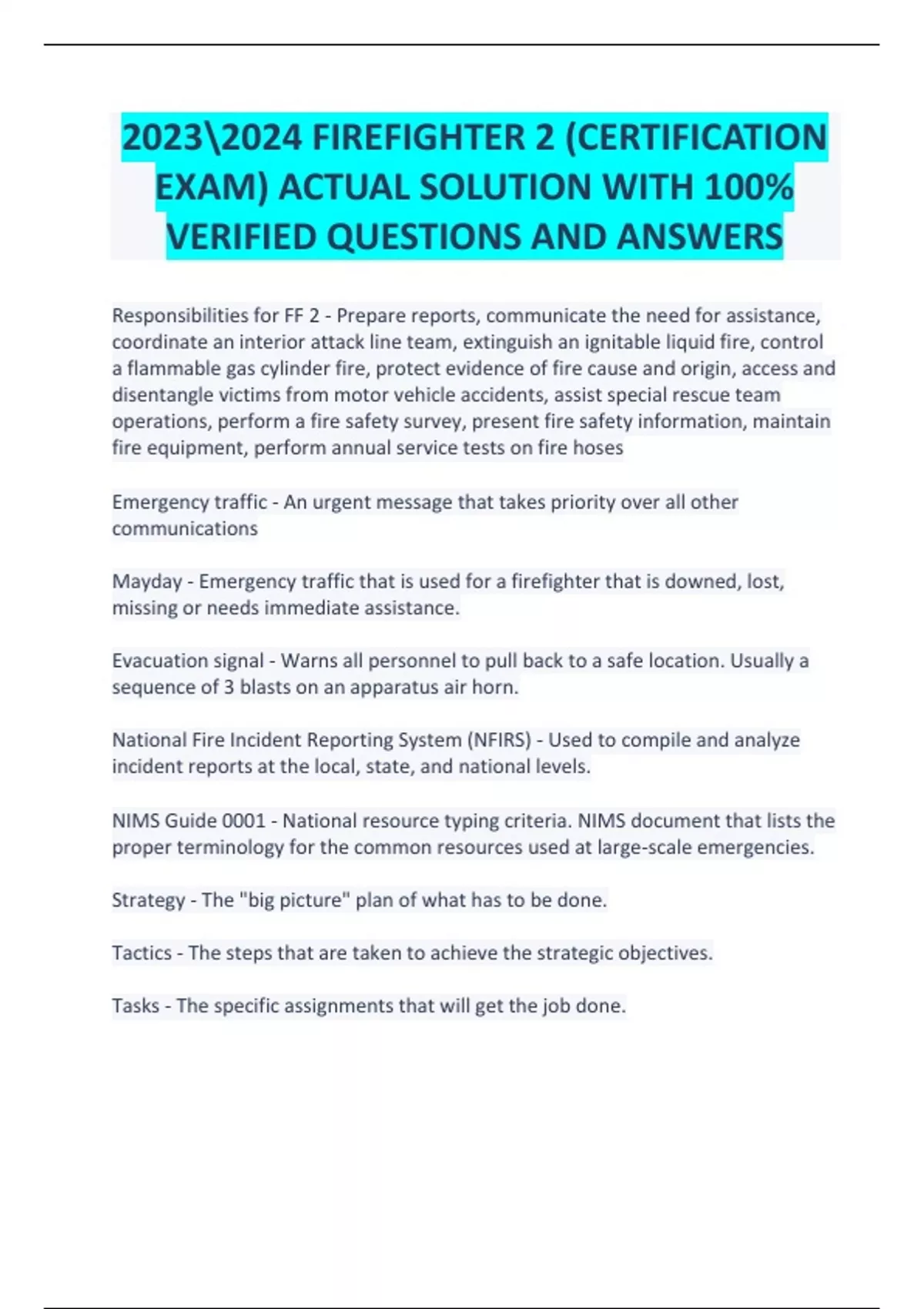 FIREFIGHTER 2 (CERTIFICATION EXAM) ACTUAL SOLUTION WITH 100% VERIFIED QUESTIONS AND ANSWERS