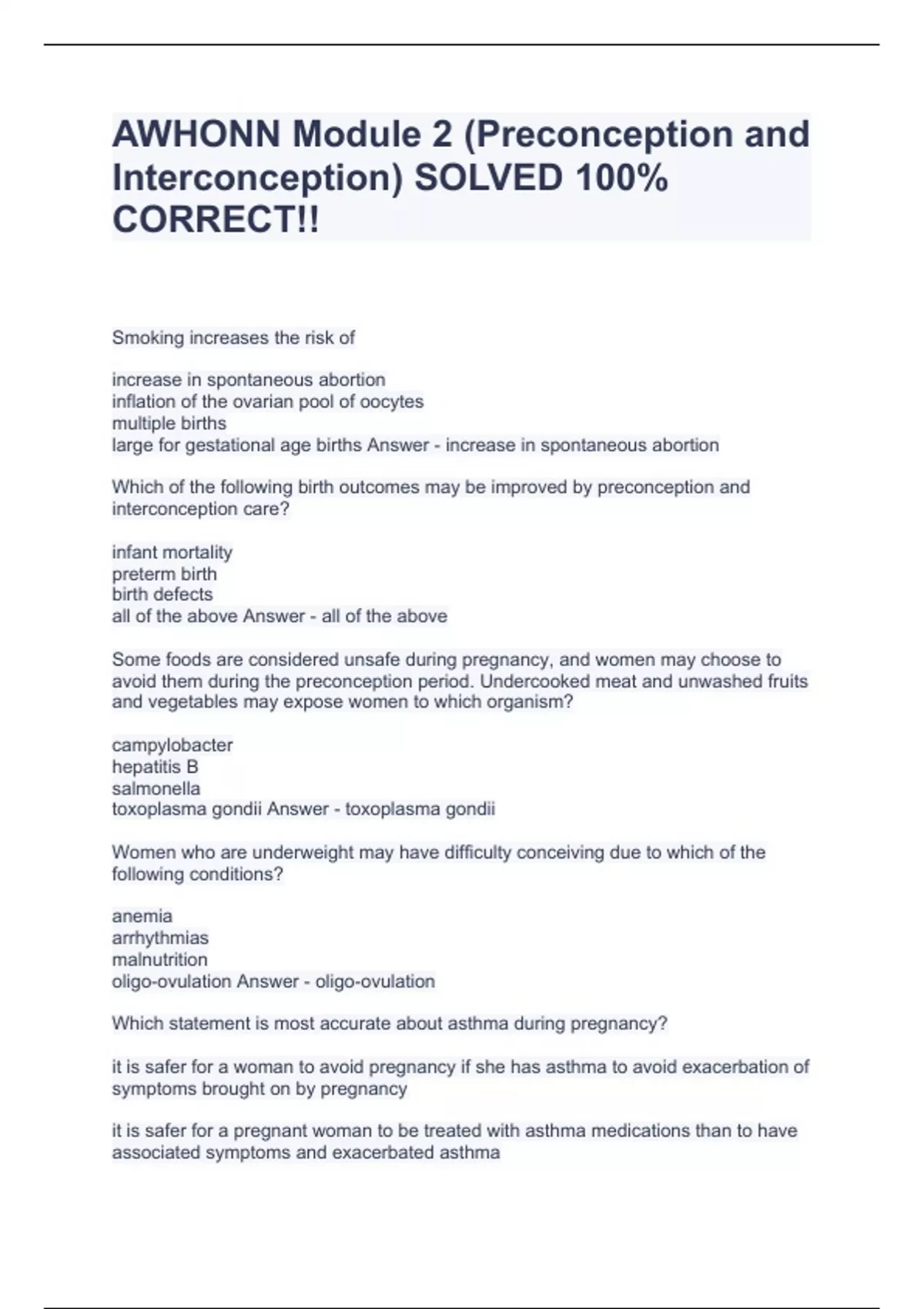 AWHONN Module 2 (Preconception and Interconception) SOLVED 100% CORRECT!!,AWHONN- Module 3 (Physiological & Psychosocial Adaption to Pregnancy) Q’s & A’s,AWHON MODULE 4 QUIZZES & ANS.,AWHONN MODULE 5 QUESTIONS CORRECTLY ANSWERED!!,AWHONN POEP Module 6 QUESTIONS AND ANSWERS ALREADY PASSED!!,AWHONN-MODULE 7 (Preterm Labor & Multiple Gestation) Comple