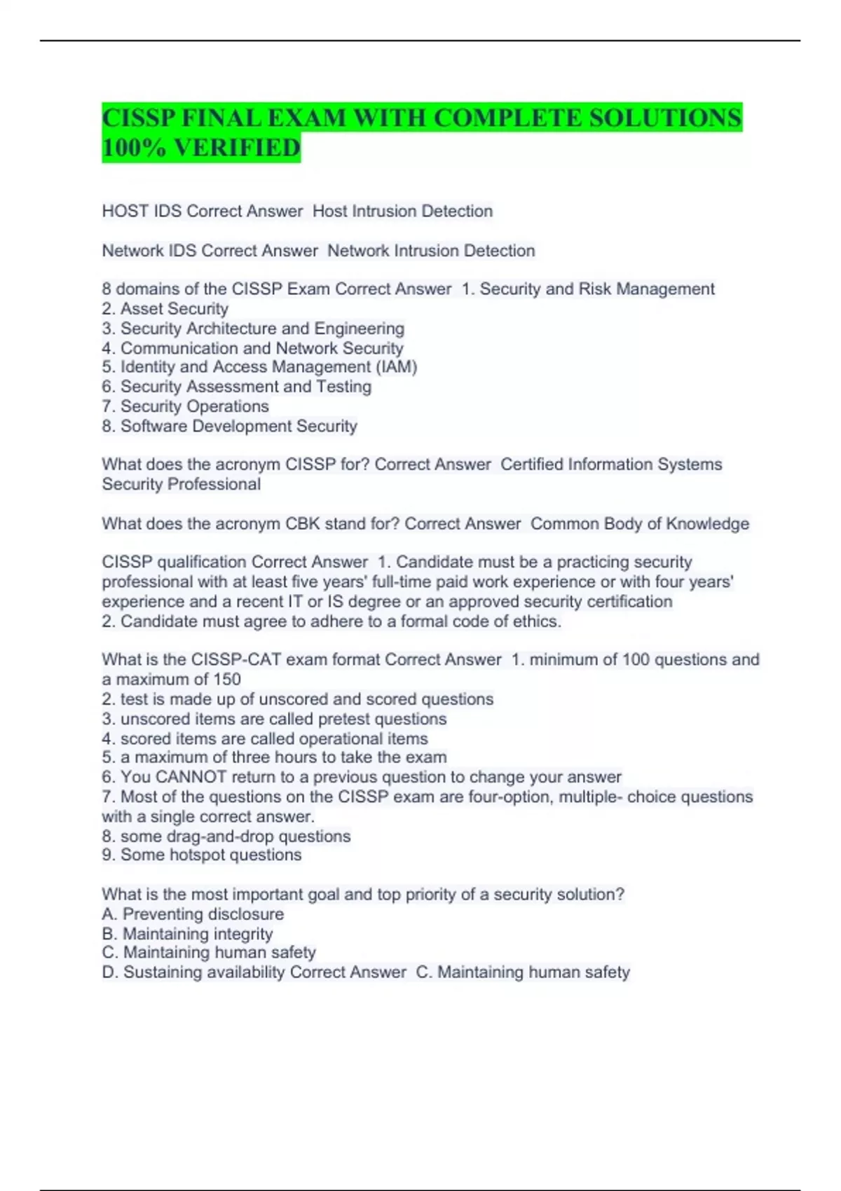 CISSP EXAM COLLECTION - PART 2 FINAL EXAM 142 PAGES WITH VERIFIED & COMPLETE SOLUTIONS 2023/2024 CISSP FINAL EXAM QUESTIONS WITH 100% CORRECT ANSWERS CISSP - Exam Practice/Study Guide 146 Questions With 100% Correct Answers CISSP FINAL EXAM WITH COMPLETE SOLUTIONS 100% VERIFIED