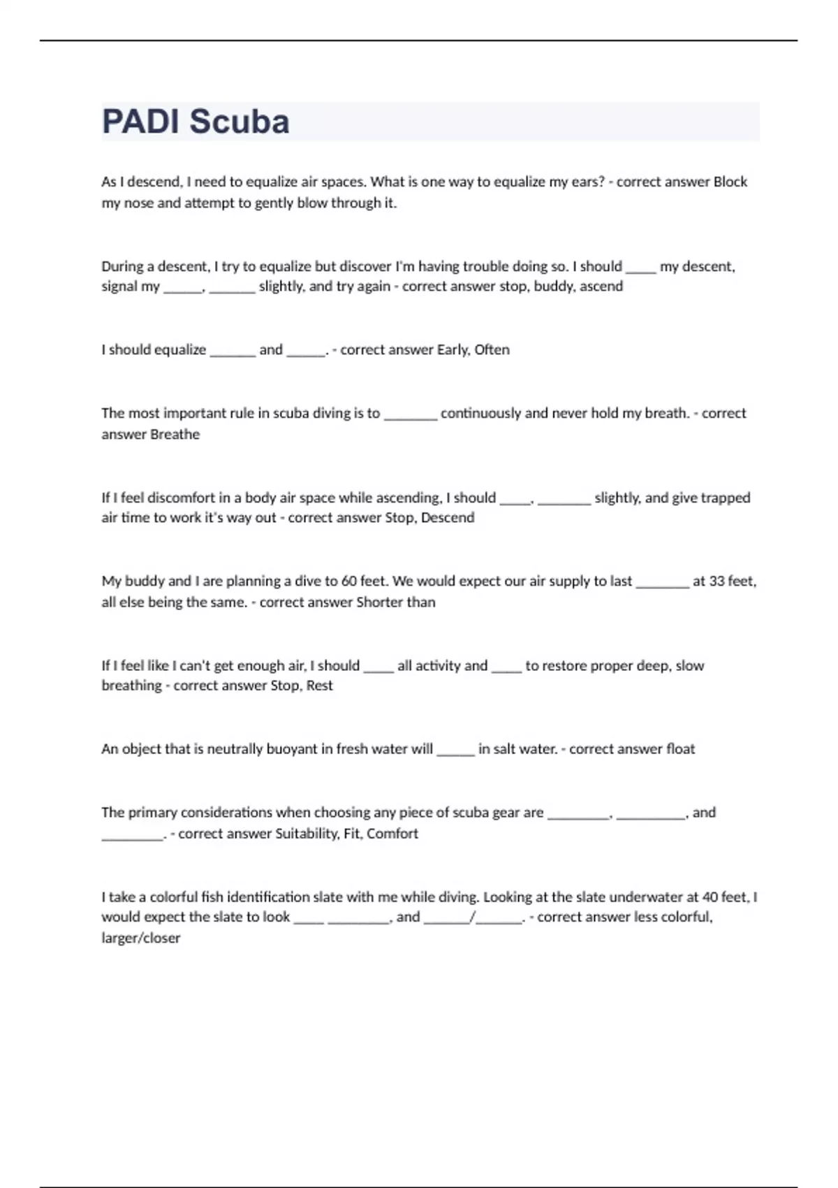 PADI Open Water Certification 2023 correctly answers 2023