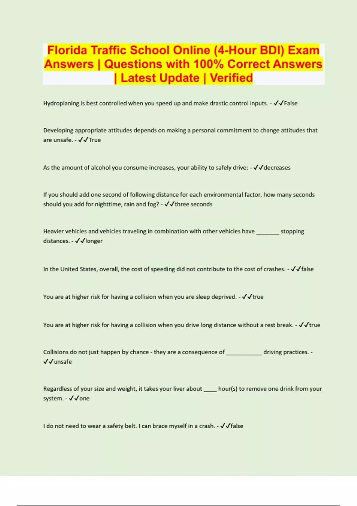 Florida Traffic School Online (4-Hour BDI) Exam Answers | Questions with 100% Correct Answers | Latest Update | Verified
