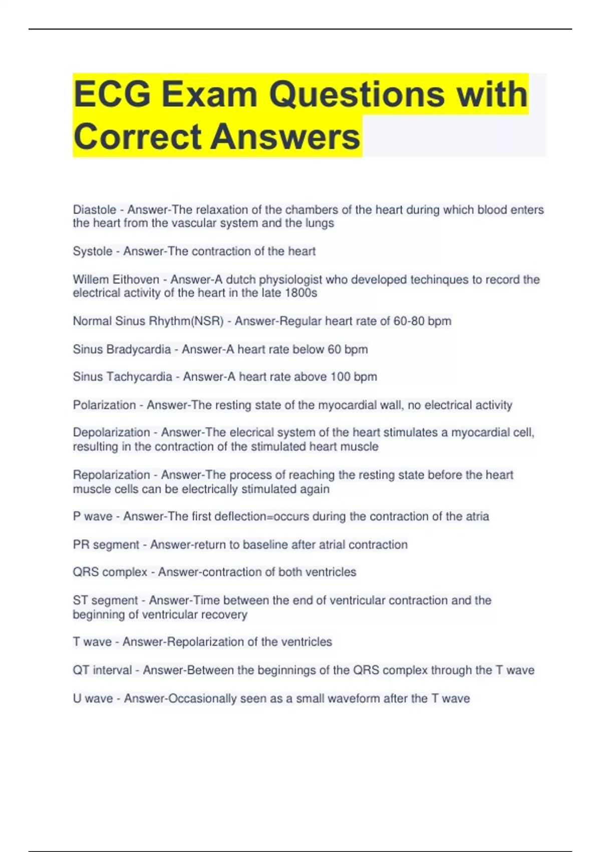 ECG Basics Exam Questions with Correct Answers 2 Exam (elaborations) ECG Practice Test Questions with Correct Answers 3 Exam (elaborations) ECG Lead System Exam Questions with Correct Answers 4 Exam (elaborations) ECG Study Questions with All Correct Answers 5 Exam (elaborations) ECG Exam Questions with All Correct Answers 6 Exam (elaborations