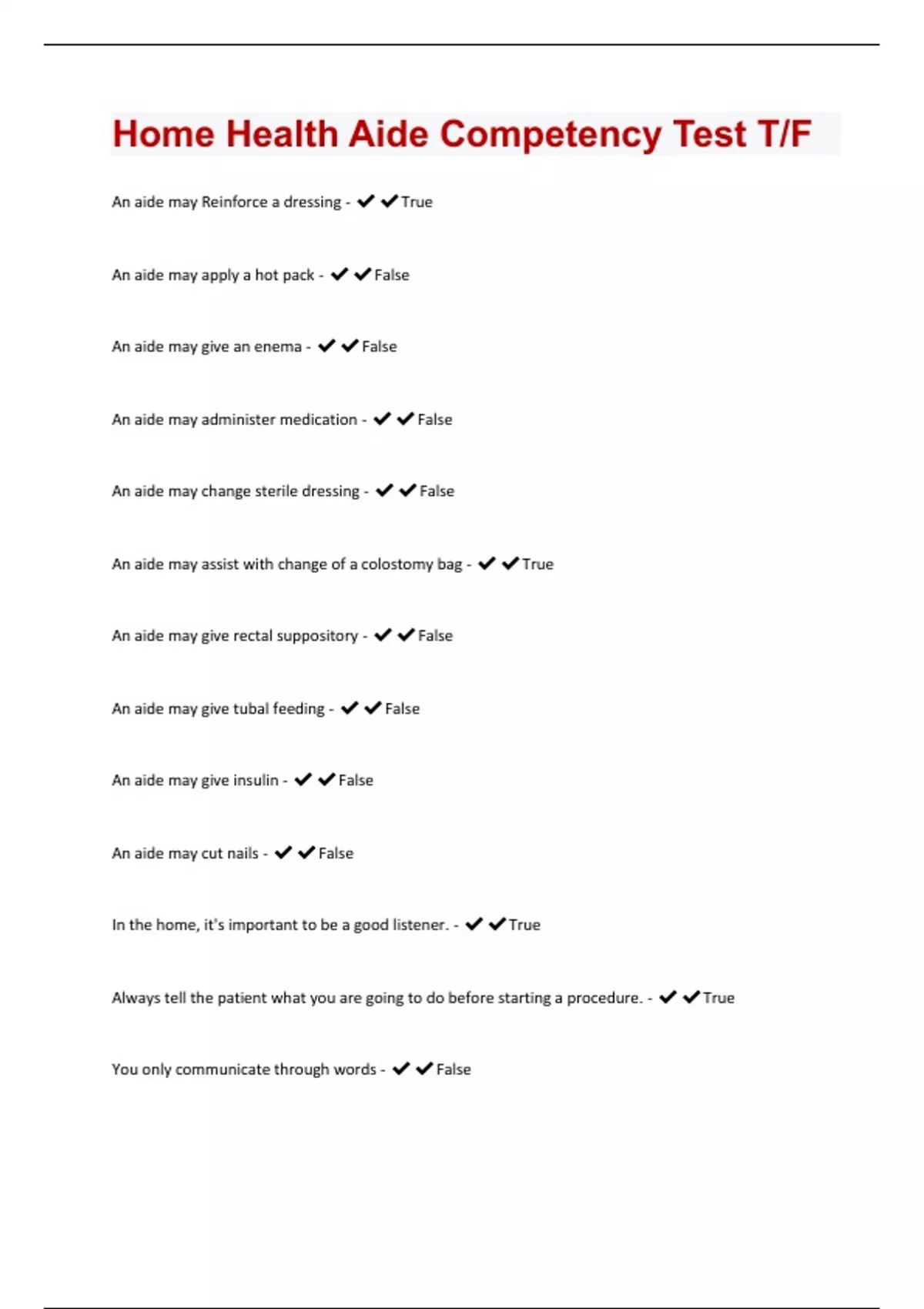 Home Health Aide Competency Test T/F Questions With 100% Correct Answers.