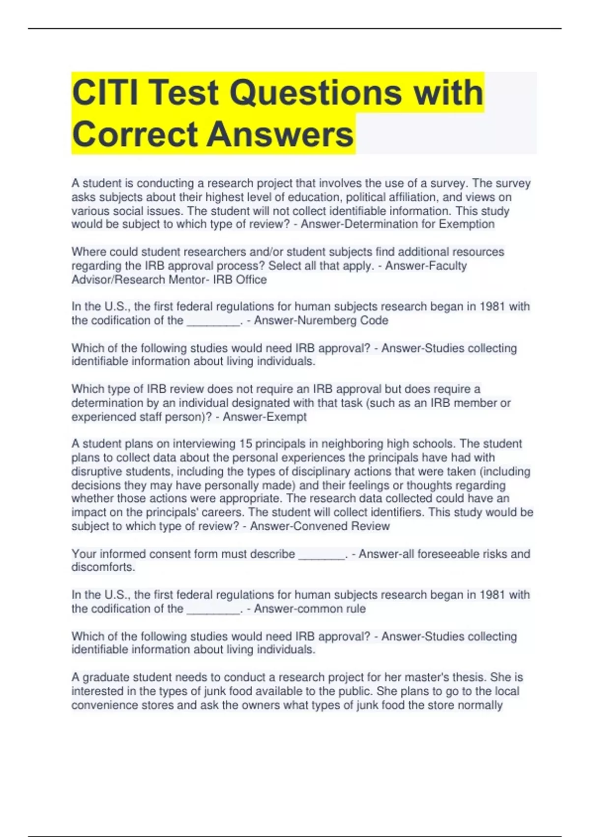 CITI 2023 Exam Questions with Correct Answers 2 Exam (elaborations) CITI Training Exam Questions and Answers All Correct 3 Exam (elaborations) CITI Study 2 Questions with Correct Answers 4 Exam (elaborations) CITI Modules 2023 Exam Questions with Correct Answers 5 Exam (elaborations) CITI 1 Exam Questions with All Correct Answers 6 Exam (elabo